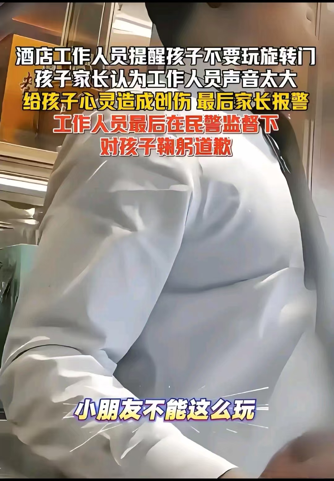 4月4日,山东某酒店工作人员见小孩玩旋转门,上前提醒以防受伤。家长认为态度不温和,声音太大给孩子造成心灵创伤,当场大声斥责并报警,最终工作人员在民警监督下向孩子鞠躬道歉!