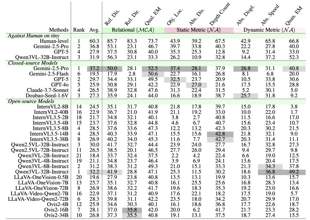 尽管 Gemini-2.5-Pro 在一众模型中取得了相对显著的优势,但整体表现仍远低于人类水平。然而,比低分更令人担忧的是,我们目前看到的所谓 “空间智能提升”,可能只是一场虚假的繁荣。