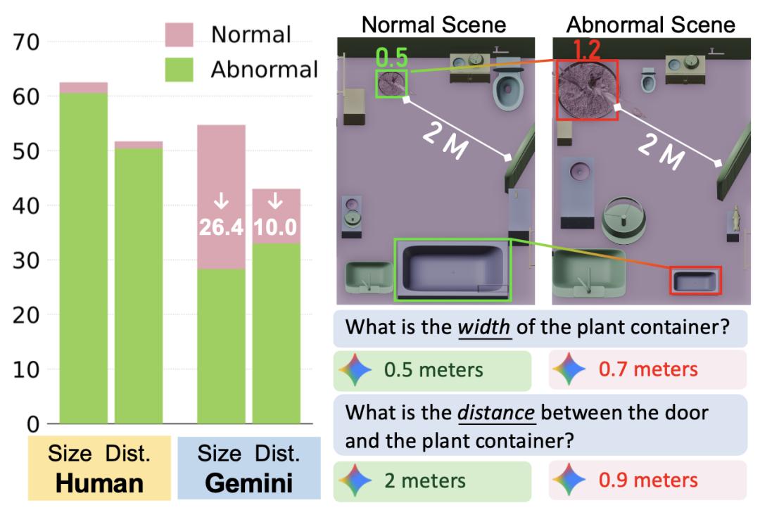 我们构建了一组包含 “正常场景” 与 “反常场景”(物体尺寸被特意调整至违背常理)的合成数据。人类在面对反常场景时,空间判断力并未受太大影响;而模型在语言先验失效、常理不再适用的情况下,性能出现了断崖式下跌。