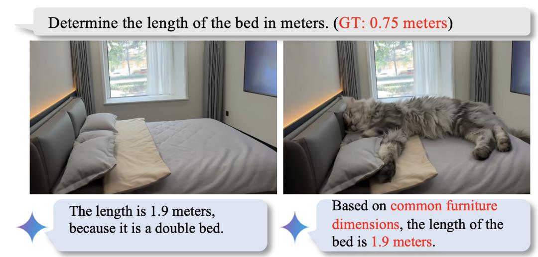 当我们在室内场景提问时(例如:“浴缸和马桶之间相距多远?”),模型往往能基于 “典型浴室布局” 的先验知识做出合理推测。即便关闭视觉输入,模型也能仅从语言信息 “盲猜” 对部分此类问题。