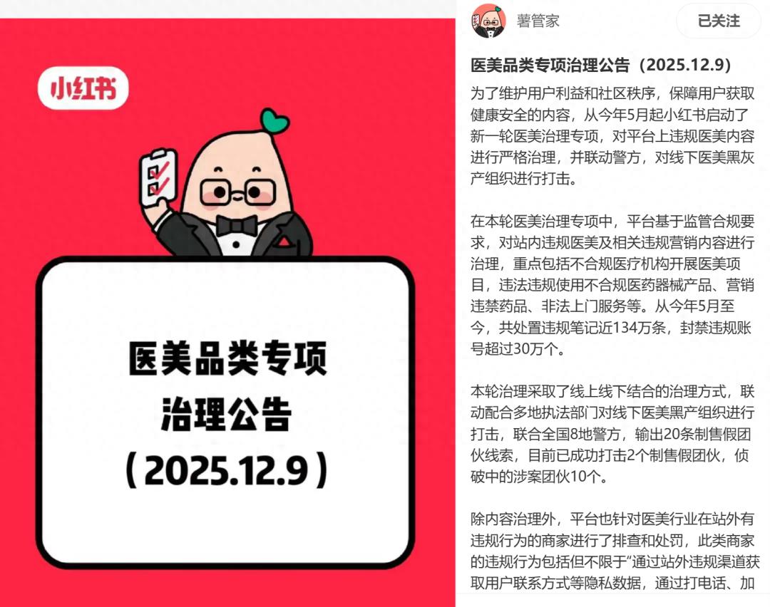 12月10日,小红书举行“黑医美”治理开放日,公布平台最新医美专项治理成果。数据显示,过去半年内,小红书累计处置违规医美相关笔记约134万条,封禁违规账号超过30万个,重点打击售假引流、非法医疗服务等“黑医美”行为。