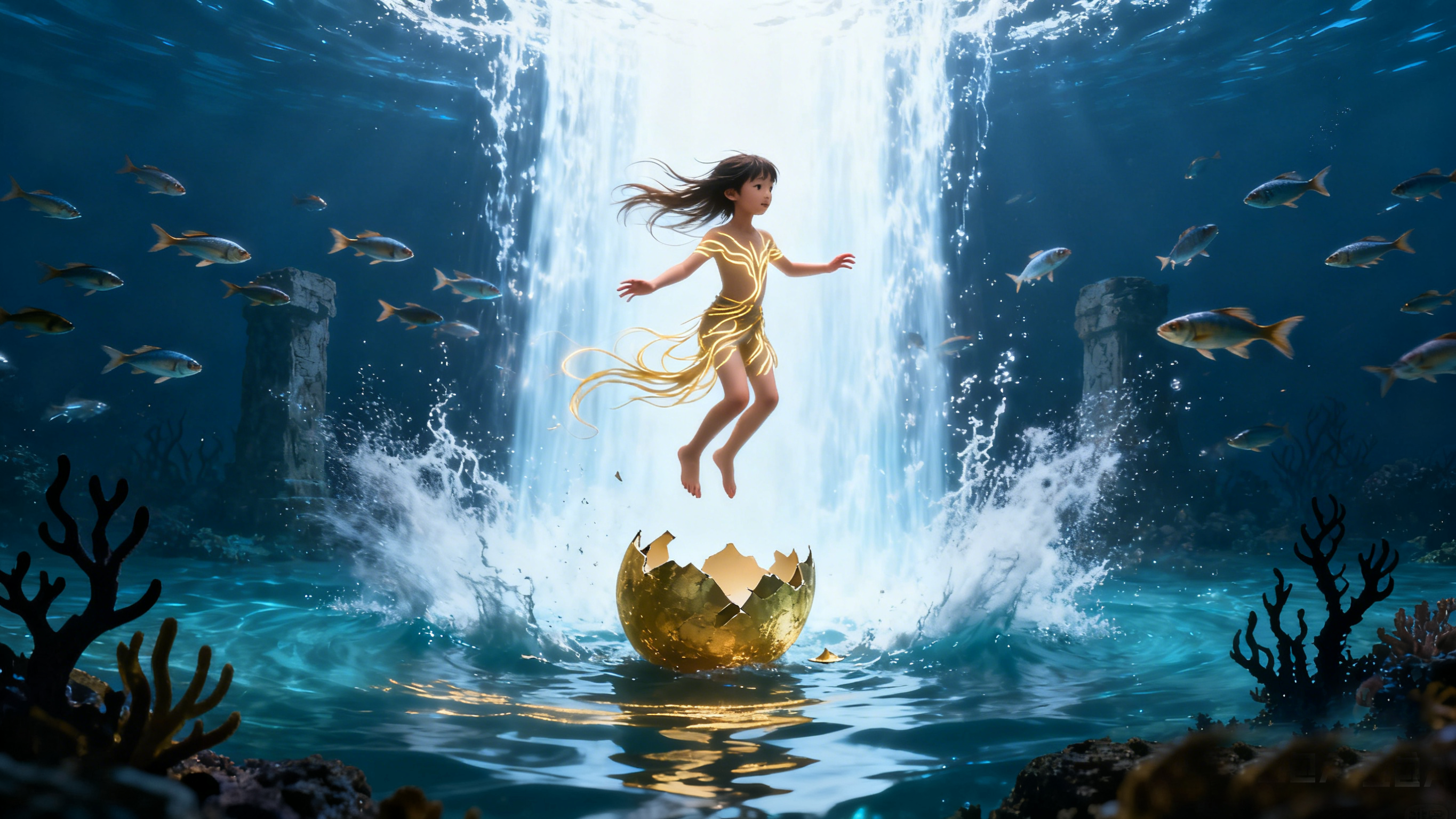 金光迸散,海底一瞬亮如白昼。光卵裂开,一名赤足童子踏浪而起。