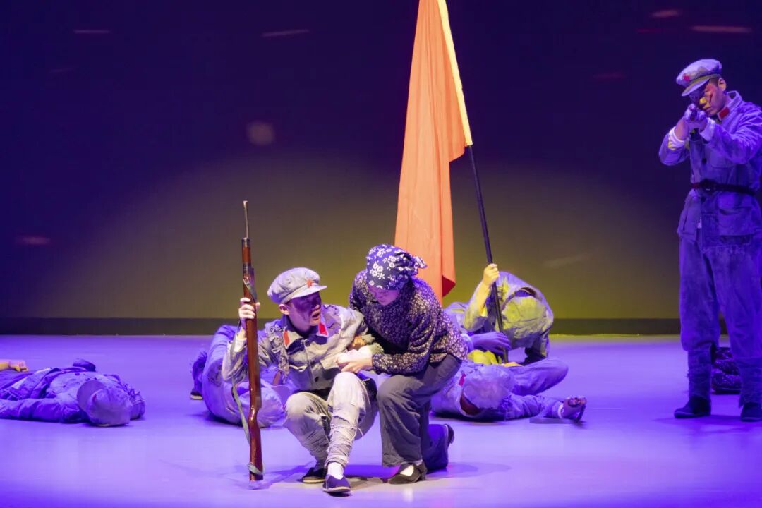 《烽火青春》讲述了新四军82名勇士为掩护大部队和群众转移,与敌人殊死搏斗、壮烈牺牲的英雄事迹,一段尘封的历史被再度点亮。演出在精心营造的视听氛围中展开,演员们身着角色服装,以真挚的情感和生动的表演,将青春热血与理想信念演绎得淋漓尽致。整场表演时而激昂澎湃,时而温情动人,赢得现场观众阵阵掌声,不仅展现出当代大学生积极进取的精神风貌,也为本次活动注入了青春朝气,使“新思想”的传播更具感染力和亲和力。