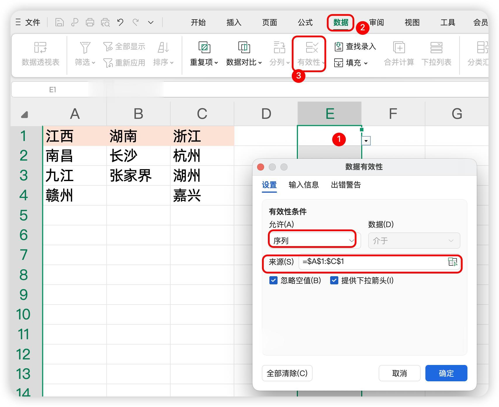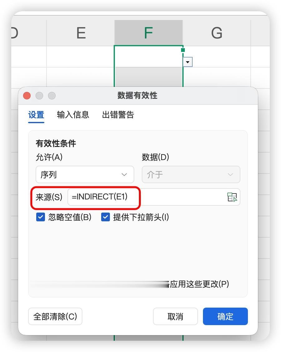然后我们选中E列的右边F列,同样的使用有效性来进行验证,这次我们在序列,里面输入公式: