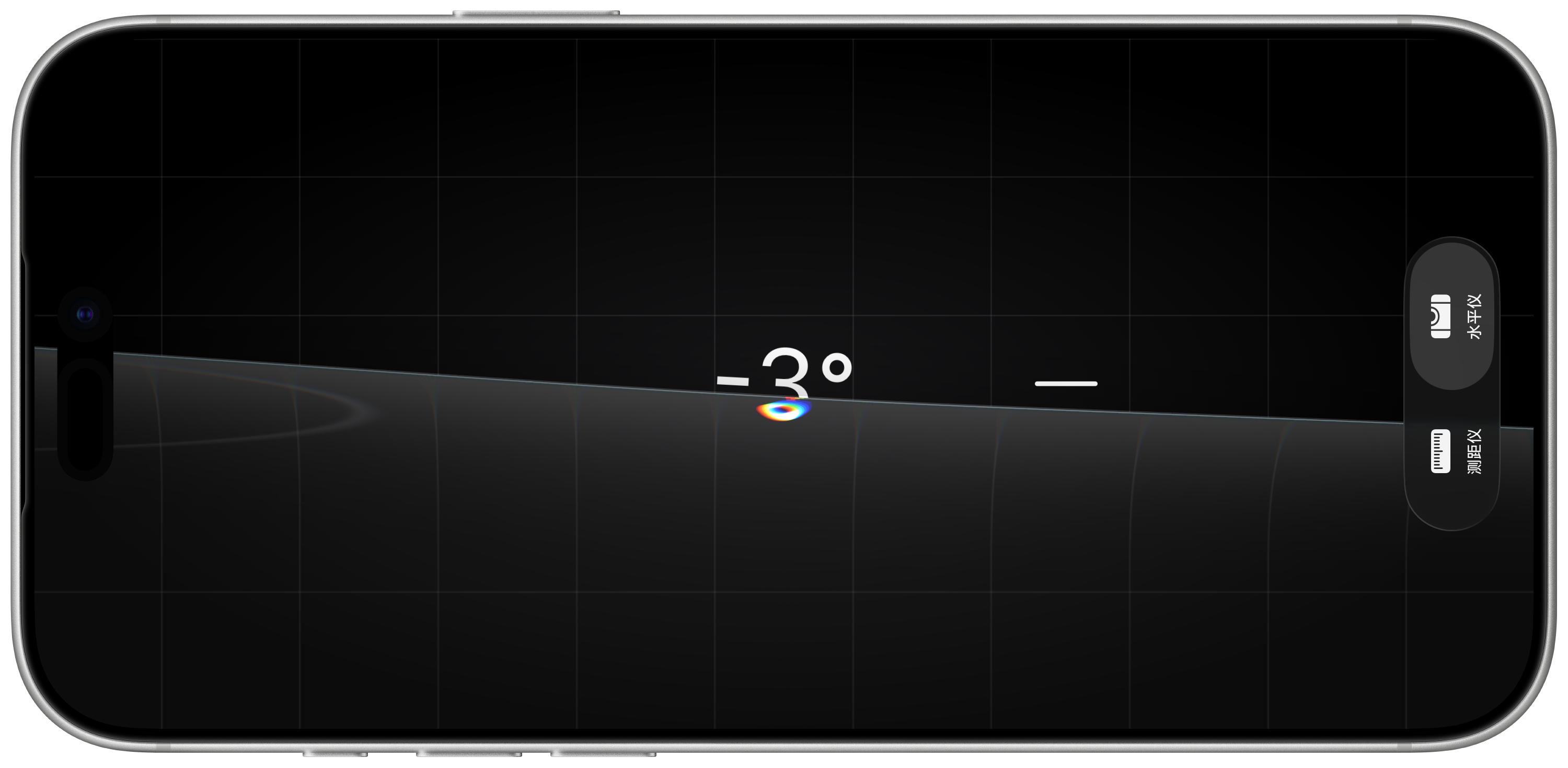 水平仪界面改进 在上个 Beta 2 版本中,测距仪 — 水平仪获得了液态玻璃界面设计,苹果在 Beta 3 中进一步改进了水平测量时的显示问题,减少数字被遮挡的情况,提高读数可视性。