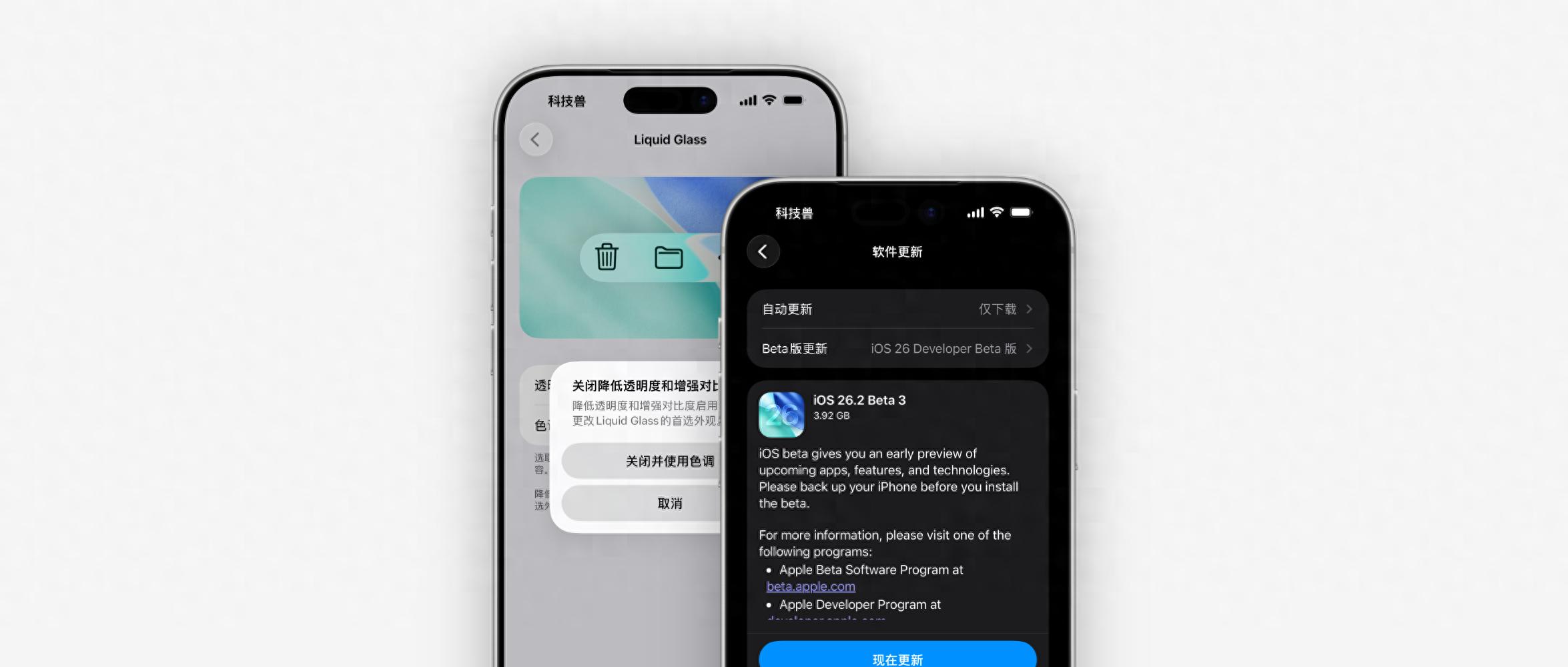 更新建议 目前正在使用 iOS 26 测试版系统的小伙伴保持更新即可。从 Beta 版的体验来看,iOS 26.2 在系统流畅度上有所优化,整体使用更加顺滑,同时修复了负一屏卡顿、控制中心残影等 Bug。虽然新功能不算多,但整体属于一次体验升级。正在使用 iOS 26 的用户,可以期待几周后即将到来的正式版本。