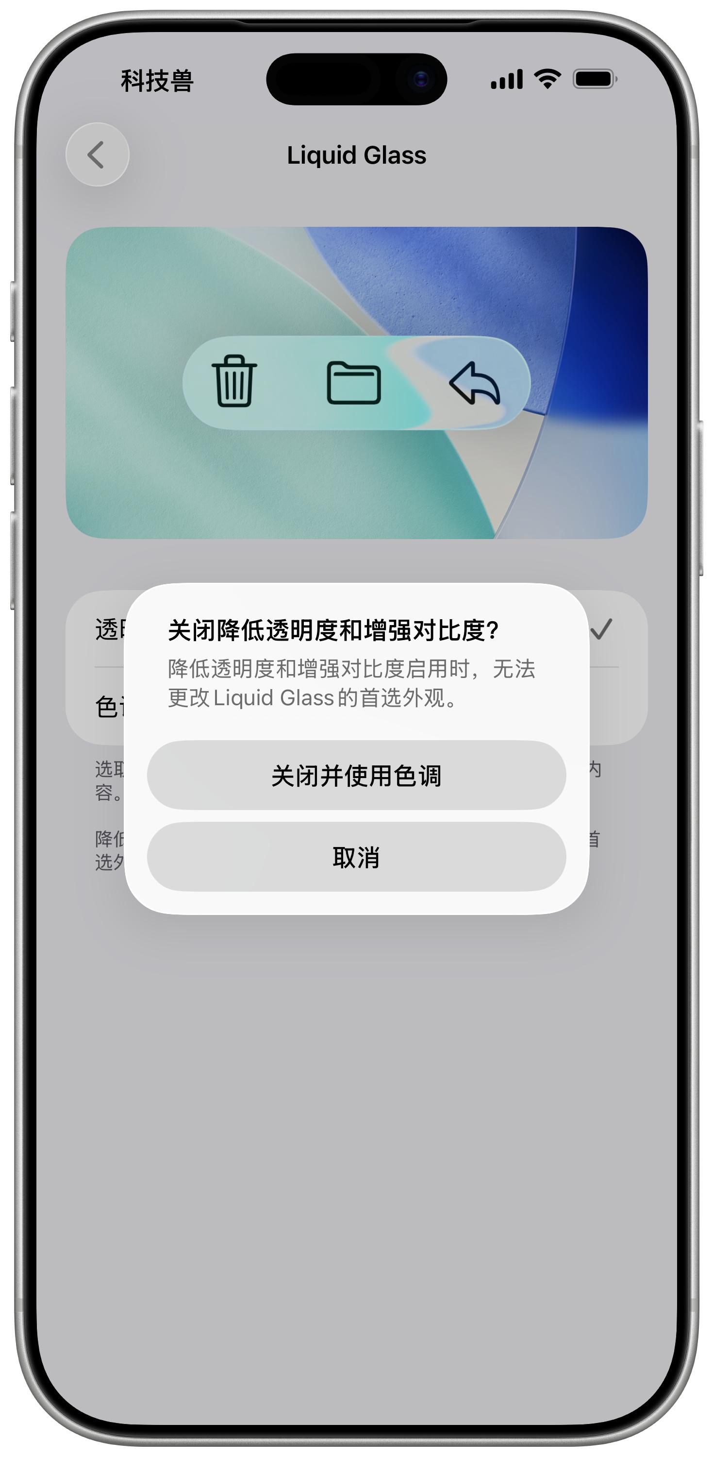 液态玻璃设置改进 苹果在 iOS 26.1 版本中增加了 显示与亮度 — Liquid Glass — 色调风格设置,在 iOS 26.2 Beta 3 中,当用户已启用降低透明度、增强对比度选项时,系统会在切换色调风格时给出提示,避免多个效果叠加导致显示异常。