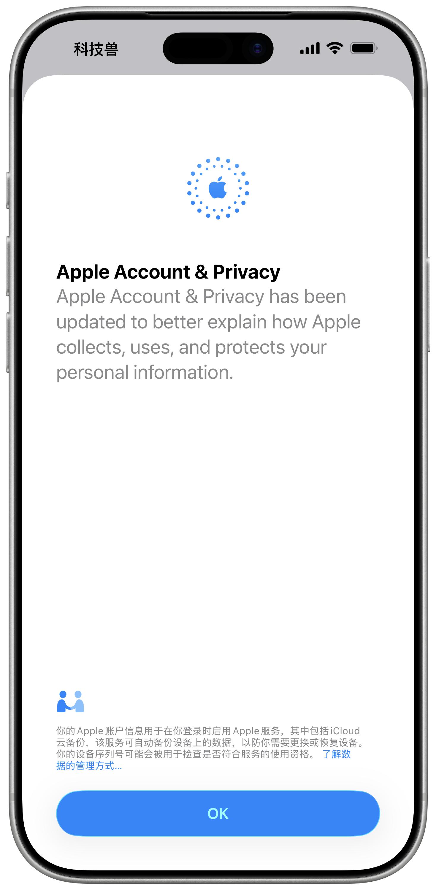 Apple 账户 更新系统后首次打开 Apple 账户页面时,会看到一则隐私说明更新提示,用于更清晰地解释苹果的数据收集与使用方式。