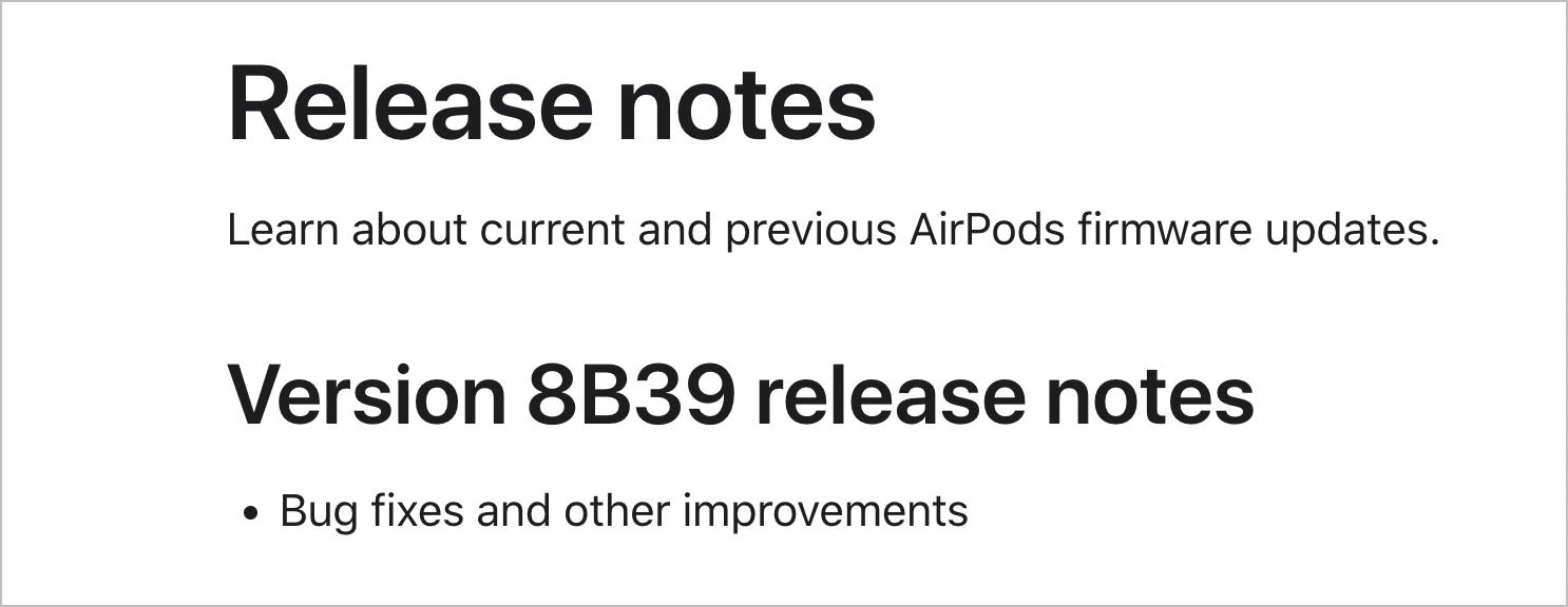 尽管苹果官网提供了 AirPods 固件更新说明,但通常不会披露具体细节。本次 8B39 固件同样仅提及「错误修复及其他改进」。
