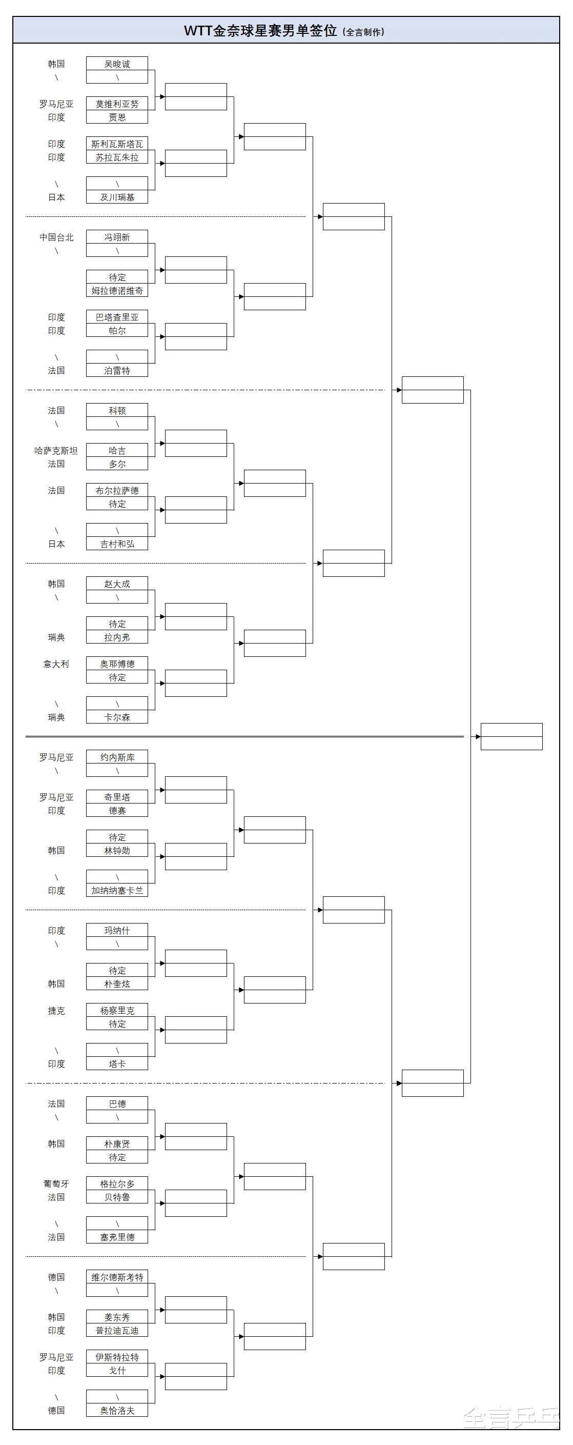2026年2月11日,印度举办的乒乓球WTT金奈球星赛男单正赛抽签结果已经出炉,在国乒全体缺席、世界排名前二十选手都不参加的情况下,韩国小将吴晙诚、德国世界冠军奥恰洛夫成为前二号种子分守上、下半区,瑞典世界冠军卡尔森在上半区,虽然高手不多但也可能爆发恶战,更多详情请看下文。