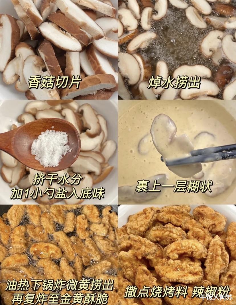 香菇切片焯水后挤干水分,加盐入底味,裹上由鸡蛋、面粉、淀粉、十三香、盐和食用油调成的糊状面糊,油热下锅炸至微黄捞出,再复炸至金黄酥脆,最后撒上烧烤料或辣椒粉,一道外酥里嫩、香气四溢的酥炸香菇就完成了。这道菜的关键在于面糊的调配和炸制的火候,掌握好这两点,就能轻松做出比饭店还好吃的家常美味。