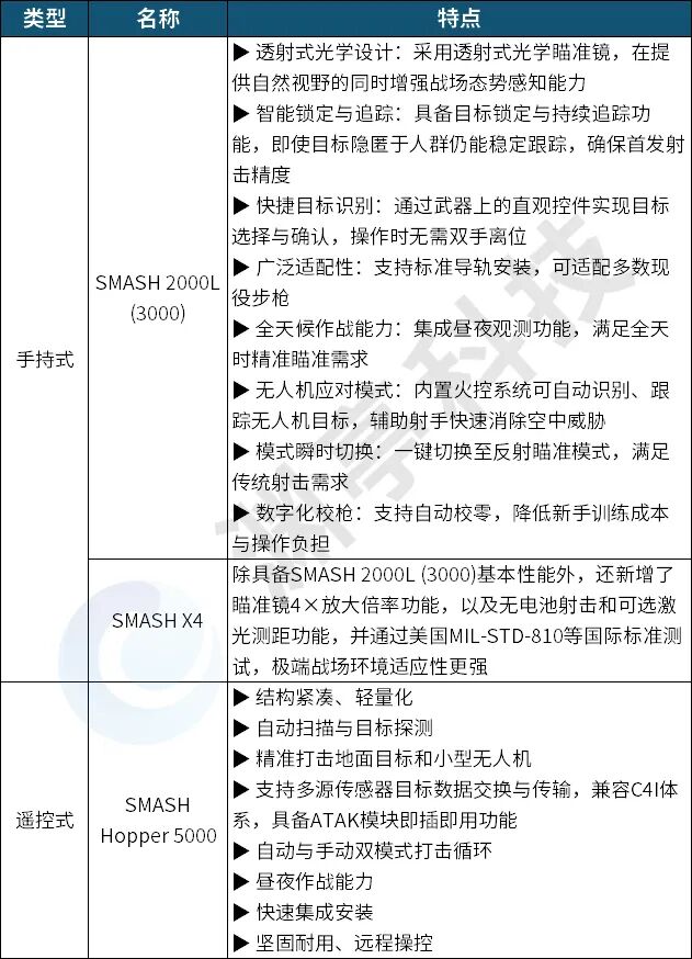 SMASH瞄准系统分为手持式和遥控式。手持式专为单兵徒步作战而设计,可快速加装于步枪,能大幅提升单兵作战效率与目标命中率;遥控式则为一款重约15公斤的轻型遥控武器站(LRCWS),可在安全距离外操控,以打击地面及空中的静止或移动目标,适配多种载具平台。