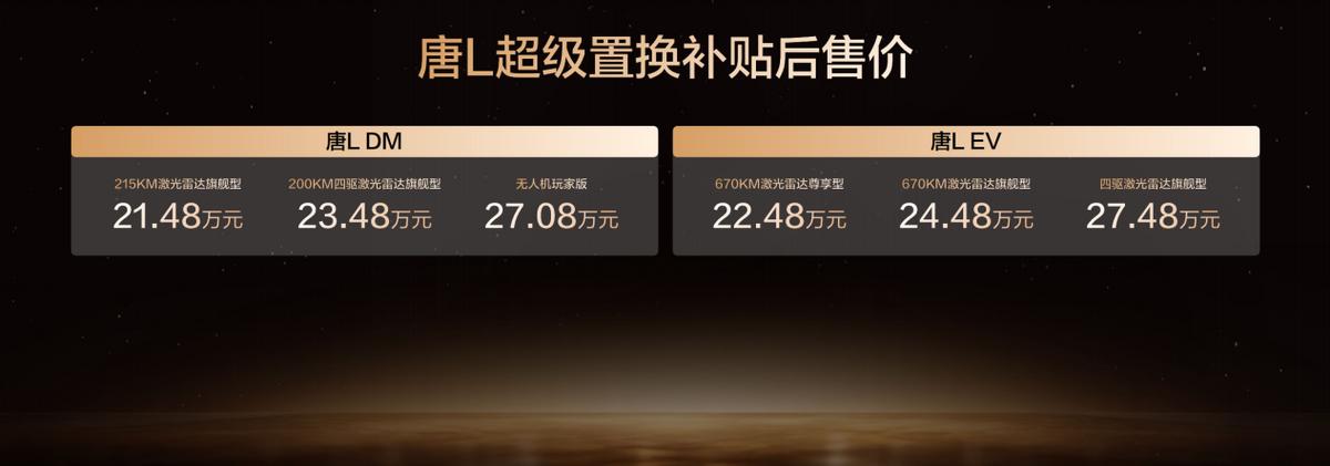 此次,汉L EV 3款车型,超级置换补贴后售价20.48万~26.48万元;汉L DM 3款车型,超级置换补贴后售价19.48万~24.48万元;唐L EV 3款车型,超级置换补贴后售价22.48万~27.48万元;唐L DM 3款车型,超级置换补贴后售价21.48万~27.08万元。同时,比亚迪还为用户准备了包含置换补贴在内的至高价值5.2万元(汉L)/4.5万元(唐L)尊享礼遇。(以上权益截至12月31日)