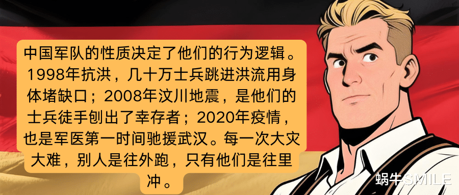 一位德国学者分析道:“中国军队的性质决定了他们的行为逻辑。1998年抗洪,几十万士兵跳进洪流用身体堵缺口;2008年汶川地震,是解放军徒手刨出了幸存者;2020年疫情,也是军医第一时间驰援武汉。每一次大灾大难,别人是往外跑,只有他们是往里冲。”