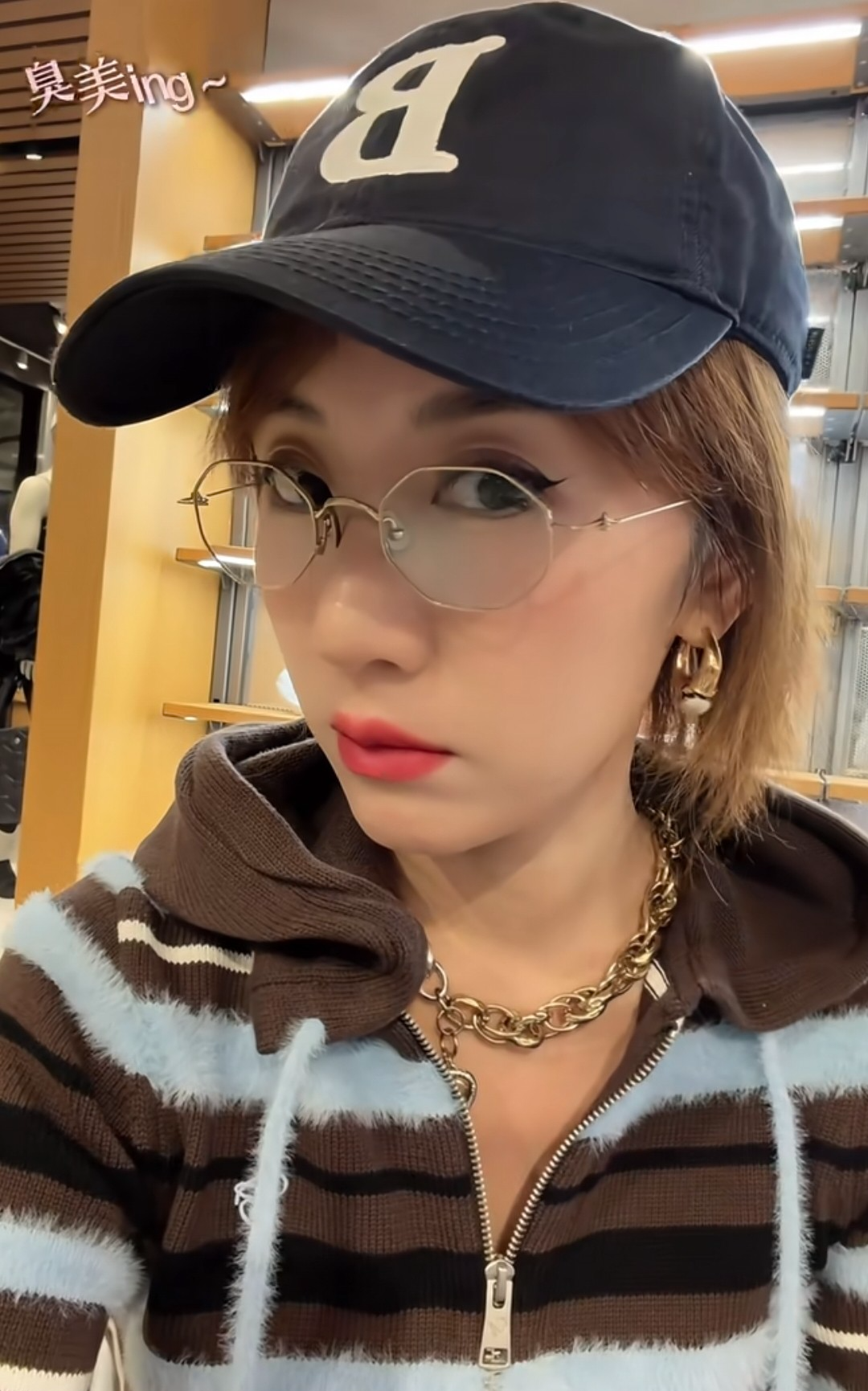 选完身上的衣服,李念不忘给自己再挑几顶帽子,出去玩都少不了用帽子凹造型,近景下她的妆容很精致,加上眼镜就更添几分知性美。