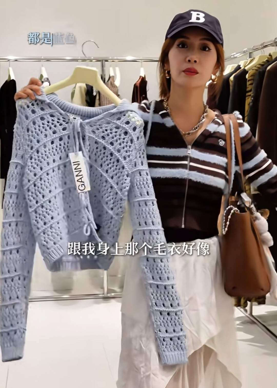 她试穿了白色连衣裙,又看上了一件短款蓝色镂空毛衣,都是比较难驾驭的款式,审美眼光是挺独特。