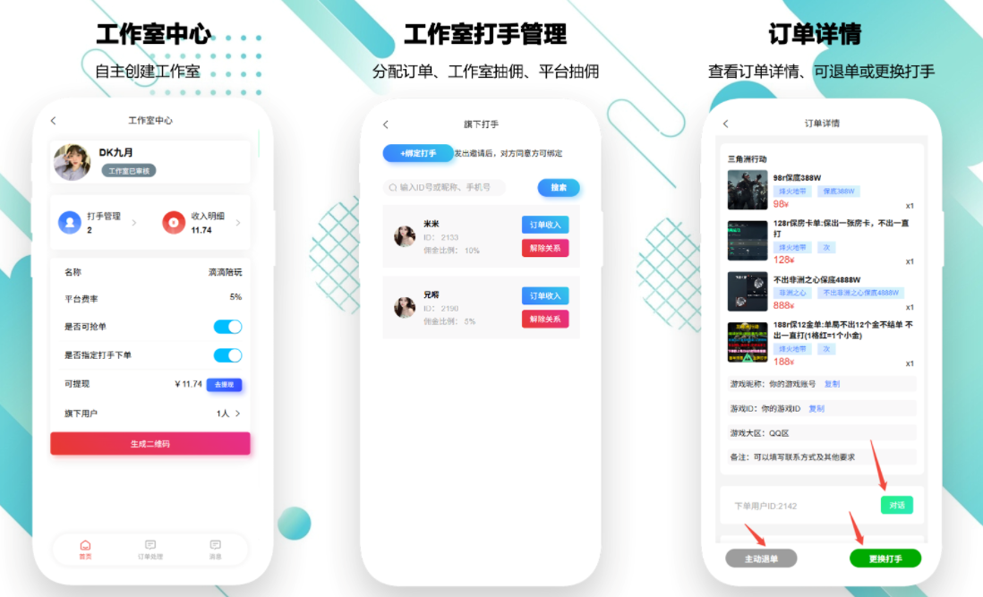 陪玩端为提供服务的玩家打造了完善的服务管理工具。陪玩者需完成实名认证和游戏技能认证,提交游戏段位截图、技术展示视频等材料,通过平台审核后即可开启服务。支持自定义服务内容,设置擅长游戏、服务价格、接单时间及服务宣言。