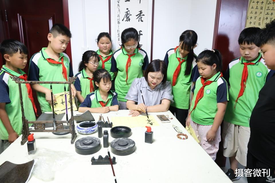 她深耕语文教学,钻研课标、因材施教,获省级骨干、市级优质课一等奖……她自学心理学,考取心理咨询师资格证,从细微表情读懂孩子,真正走进他们的世界;她三十年坚持书法,笔墨凝志,将汉字之美融入课堂,带领学生写下秀美字迹、捧回奖项。图为刘艳丽老师亲自示范,手把手教同学们写好毛笔字。