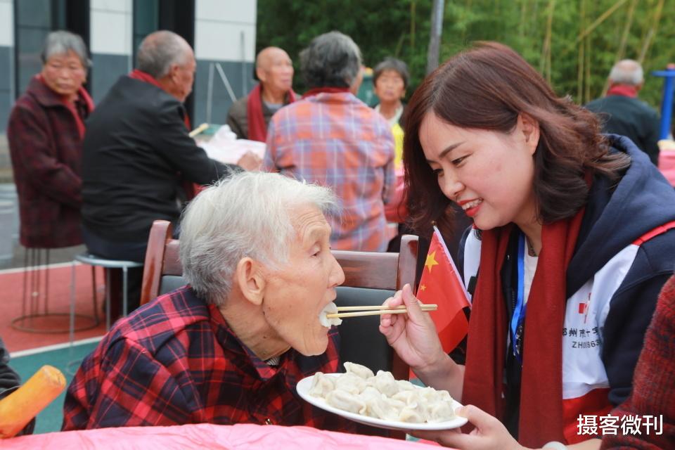 在重阳节敬老爱老饺子宴公益活动中,刘艳丽老师俯下身,为行动不便的老人喂美味的饺子。