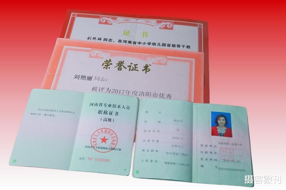 “躬耕教坛,强国有我。这不是口号,是我一生的誓言。”如今,刘艳丽老师被评为河南省省级骨干教师、洛阳市优秀教师、优秀班主任,还是国家三级心理咨询师、汝阳县政协委员、汝阳县书法家协会副主席。图为刘艳丽老师获得的荣誉证书。