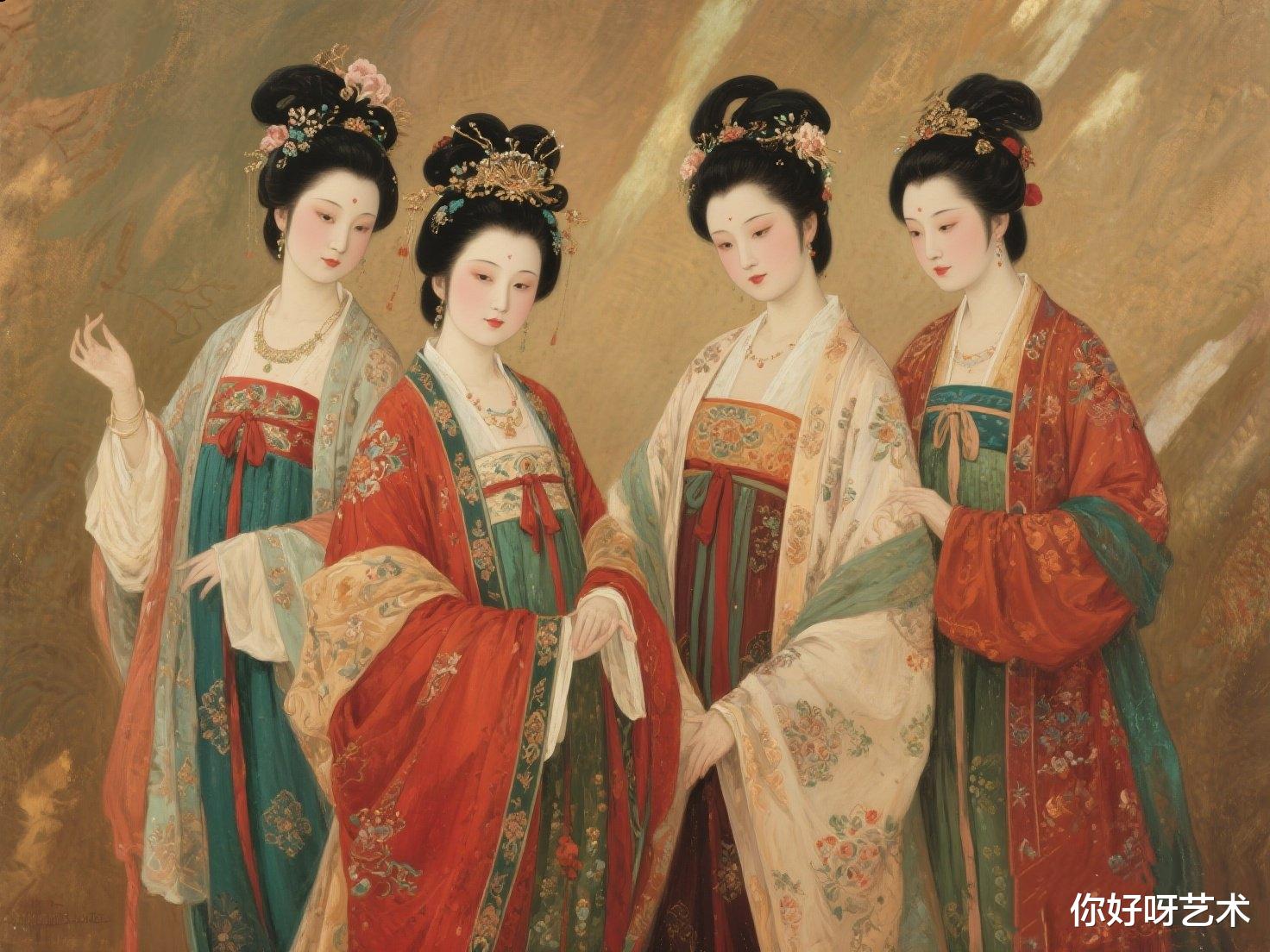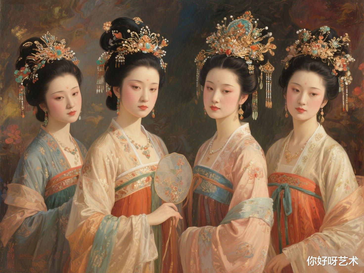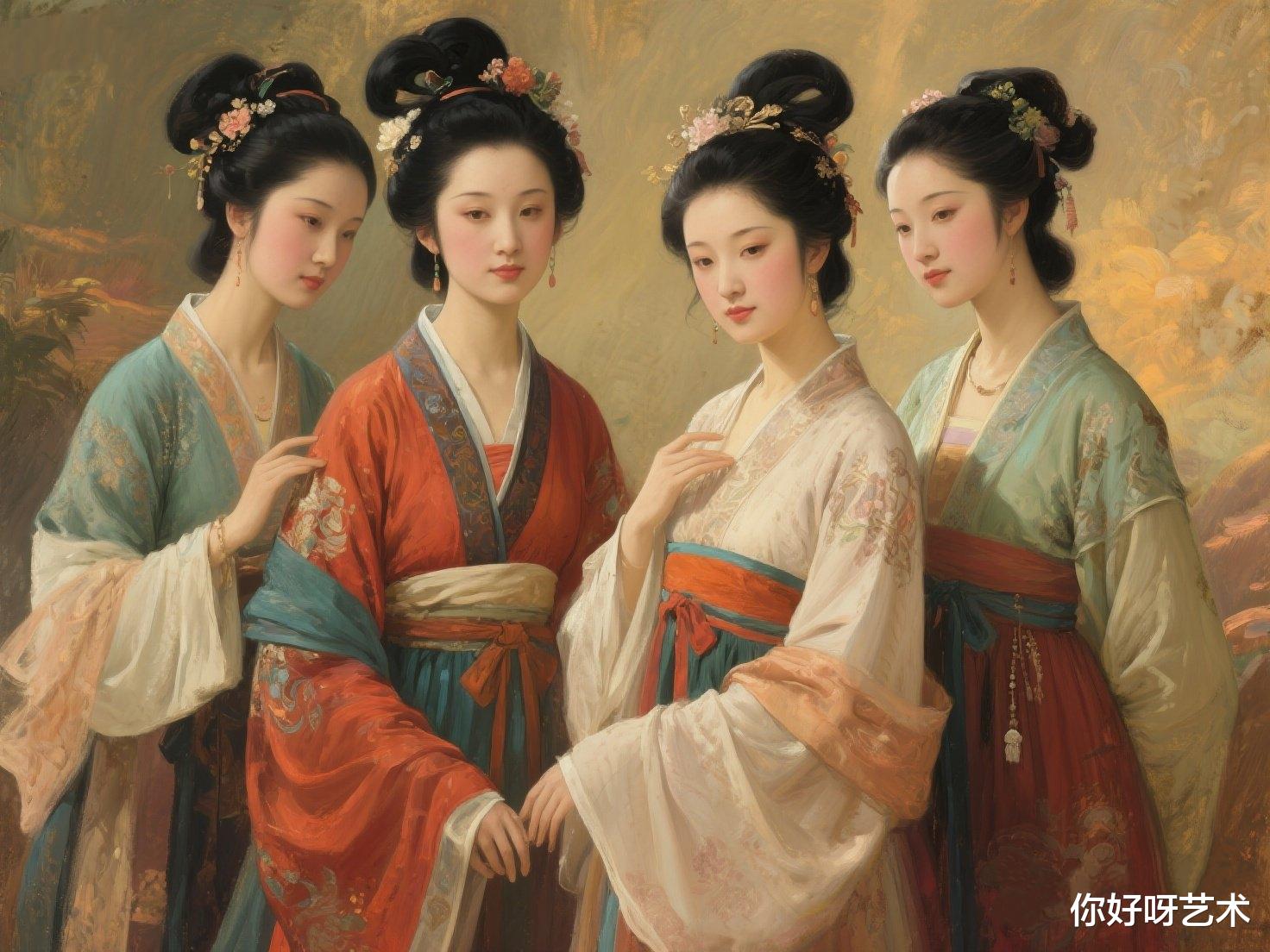 再看她们的服饰,那是一场宋代服饰文化的华丽展示。四位美人的服饰色彩鲜艳而不失庄重,或为淡雅的浅色系,如浅粉、淡绿,宛如春日里盛开的花朵,散发着清新的气息;或为浓郁的深色系,如绛红、深蓝,恰似夜空中的繁星,透着高贵与神秘。服饰上的花纹精致细腻,有繁复的花卉图案,那盛开的花朵仿佛在衣袂间随风摇曳,充满了生机;还有精美的几何图案,线条流畅,对称而富有韵律感,彰显出宋代工艺的高超水准。这些服饰的样式,宽袍大袖,长裙曳地,走起路来衣袂飘飘,既符合宋代服饰的特点,又赋予了人物一种飘逸出尘的气质。