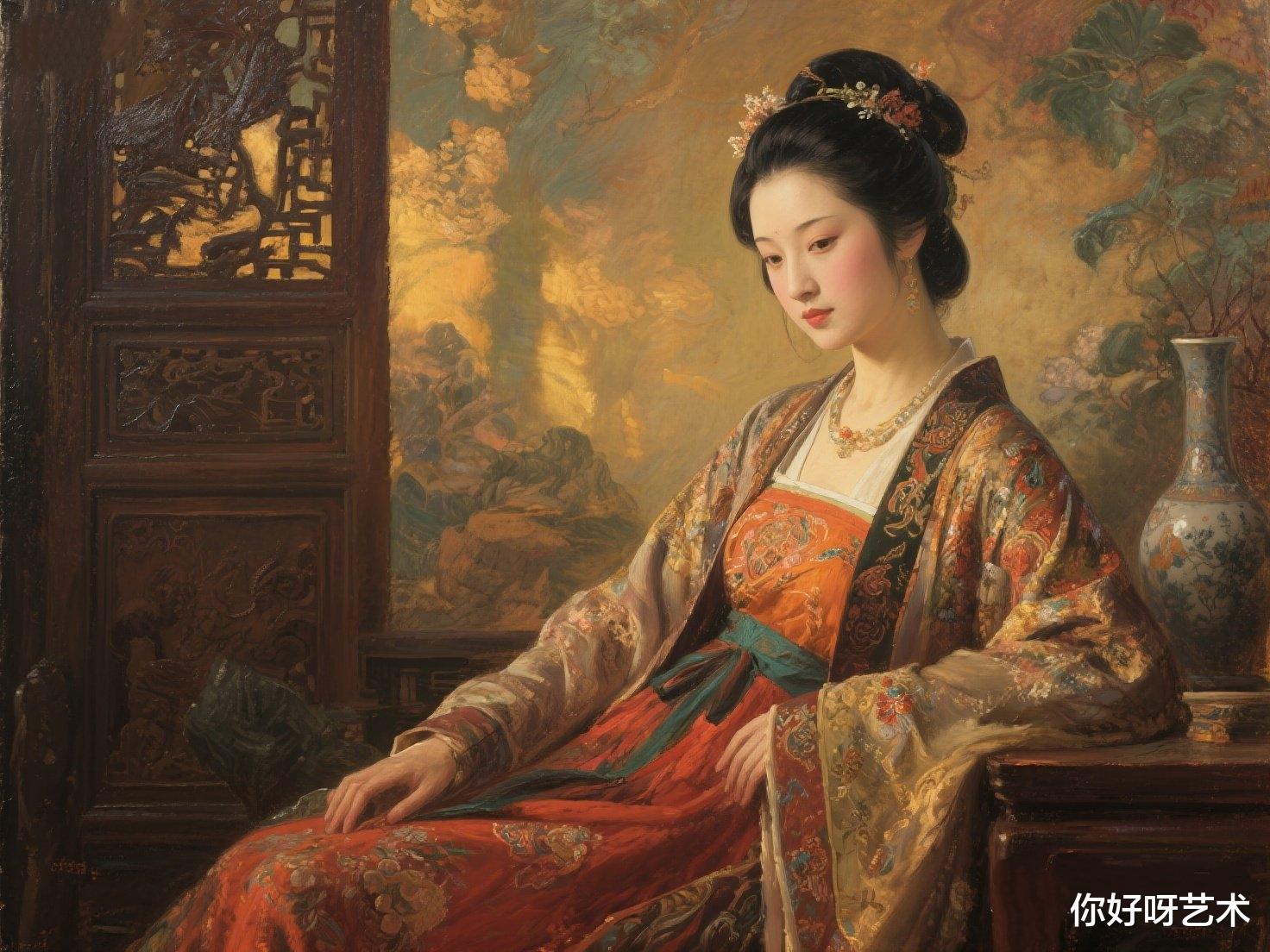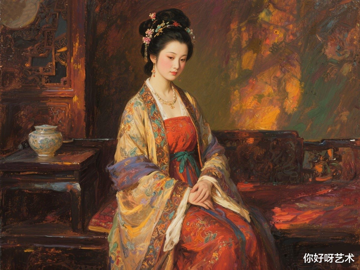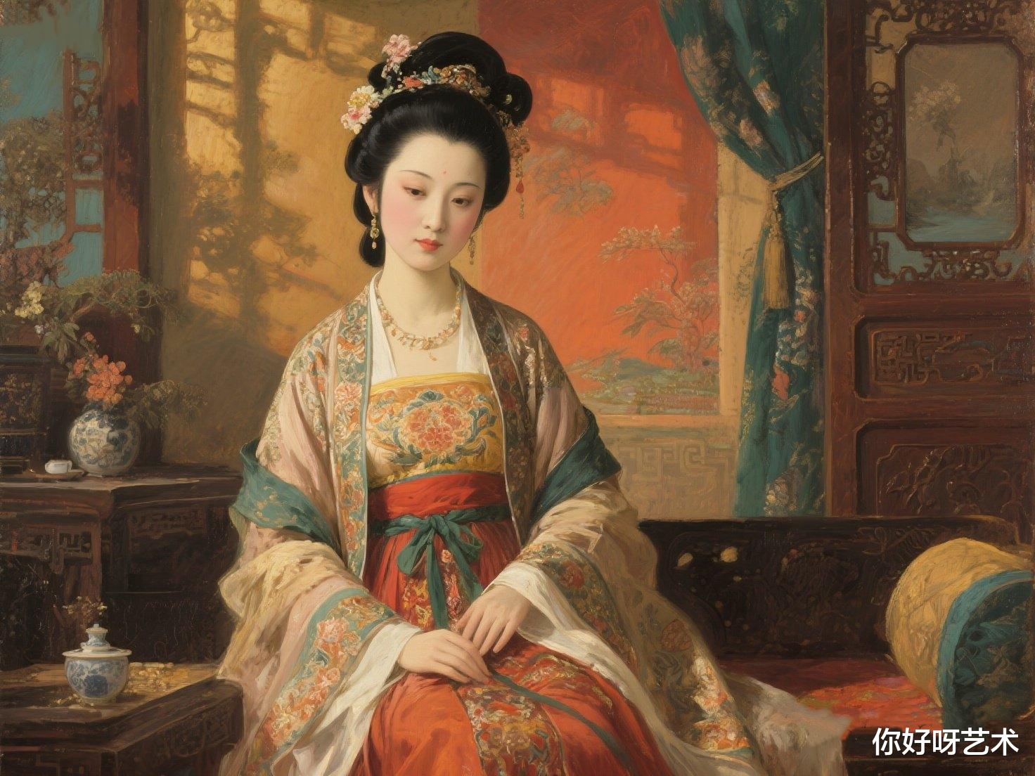 再看她们的服饰,那是一场宋代服饰文化的华丽展示。四位美人的服饰色彩鲜艳而不失庄重,或为淡雅的浅色系,如浅粉、淡绿,宛如春日里盛开的花朵,散发着清新的气息;或为浓郁的深色系,如绛红、深蓝,恰似夜空中的繁星,透着高贵与神秘。服饰上的花纹精致细腻,有繁复的花卉图案,那盛开的花朵仿佛在衣袂间随风摇曳,充满了生机;还有精美的几何图案,线条流畅,对称而富有韵律感,彰显出宋代工艺的高超水准。这些服饰的样式,宽袍大袖,长裙曳地,走起路来衣袂飘飘,既符合宋代服饰的特点,又赋予了人物一种飘逸出尘的气质。