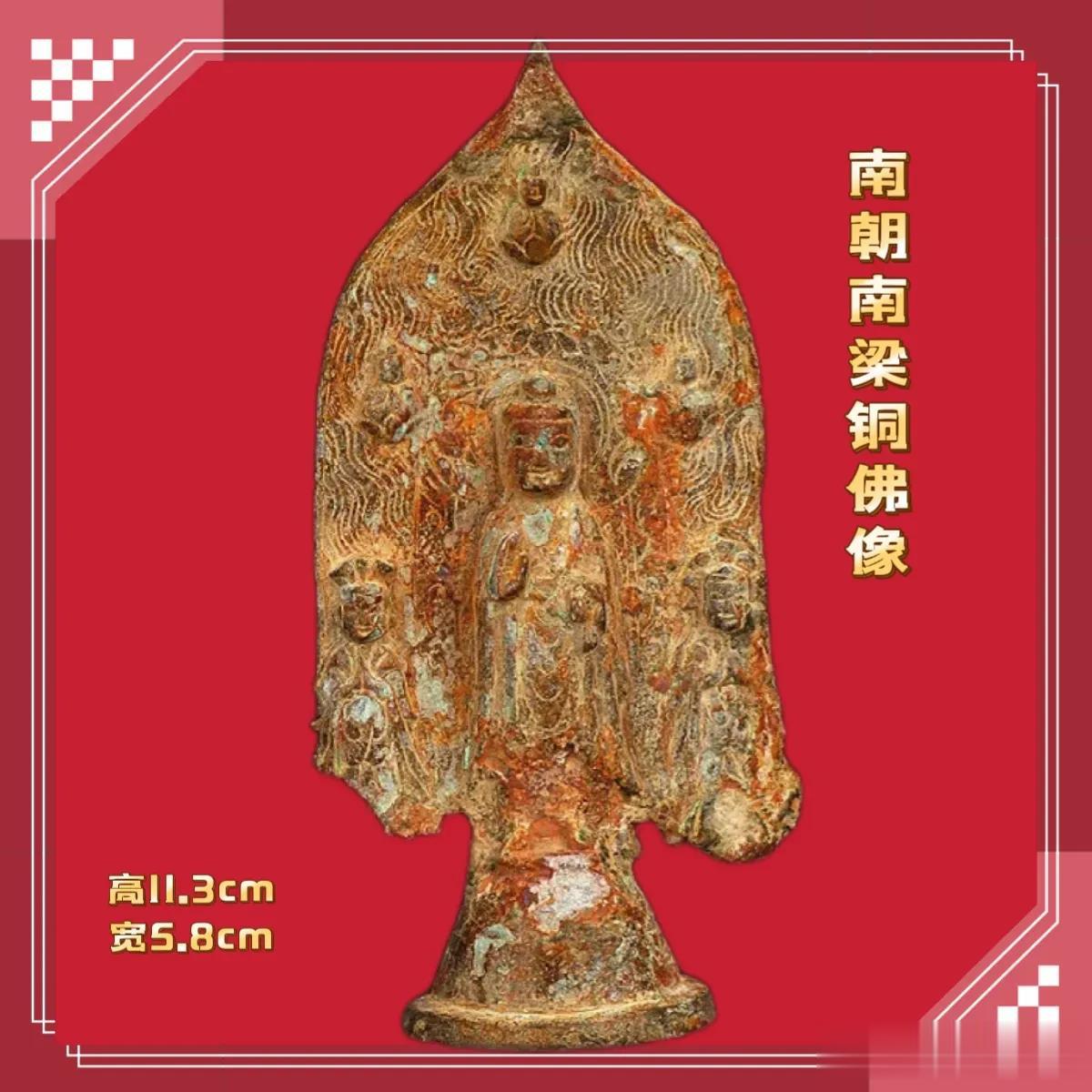 这件南朝南梁铜造佛像(梁大通元年,公元527年),为南京地区仅见的南朝造像。青铜质地,佛像立于莲座,高髻通肩大衣,右手施无畏印、左手为与愿印,舟形背光浅刻火焰纹。