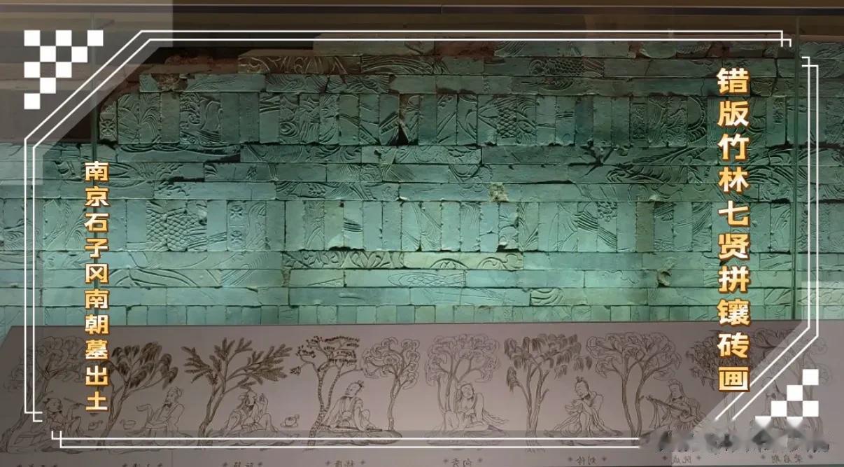 这幅错版竹林七贤拼镶砖画《竹林七贤与荣启期》 ,是南朝模印砖画的珍品(2010年南京石子冈南朝墓出土)。它与南博同款砖画同源,绘七贤与荣启期风雅形象。