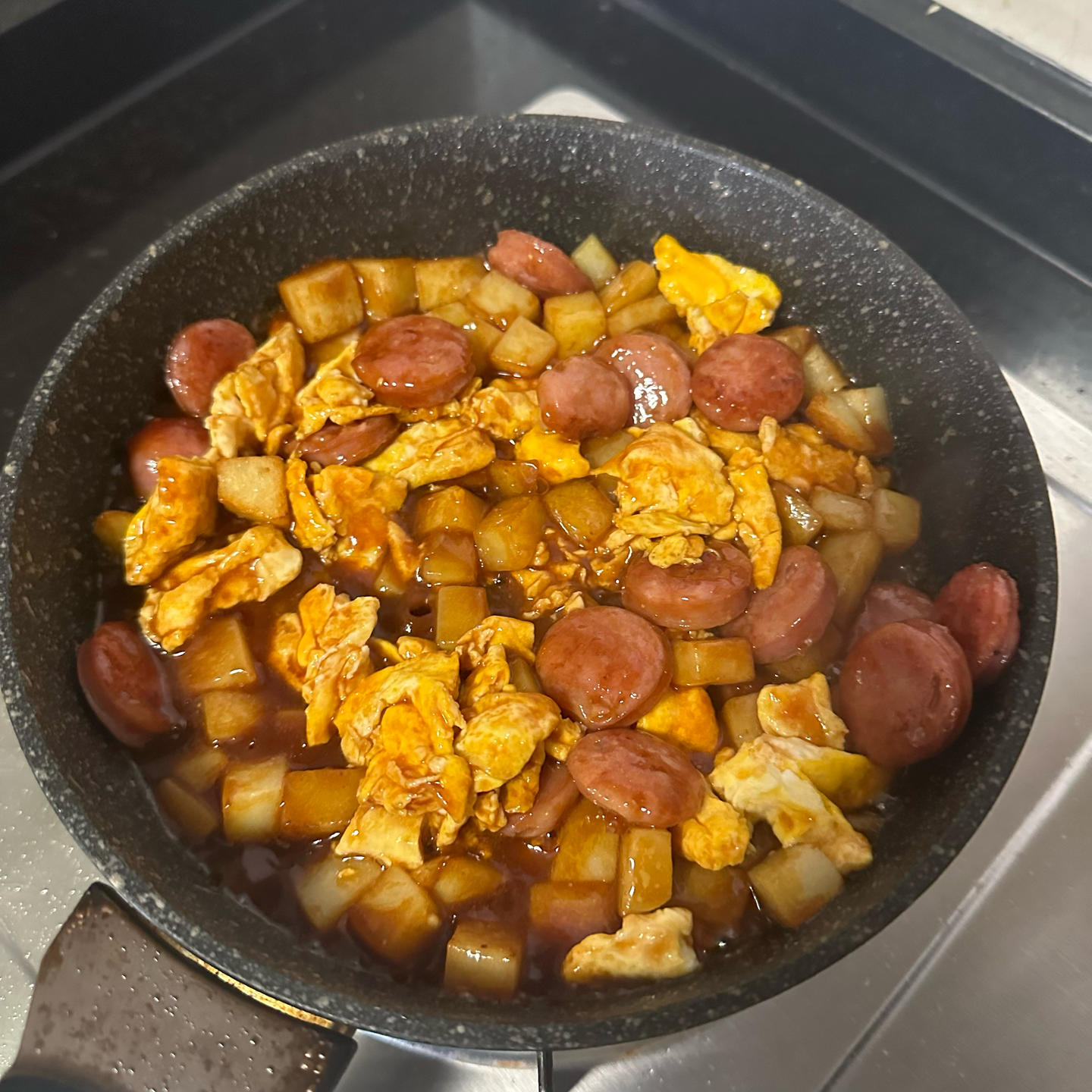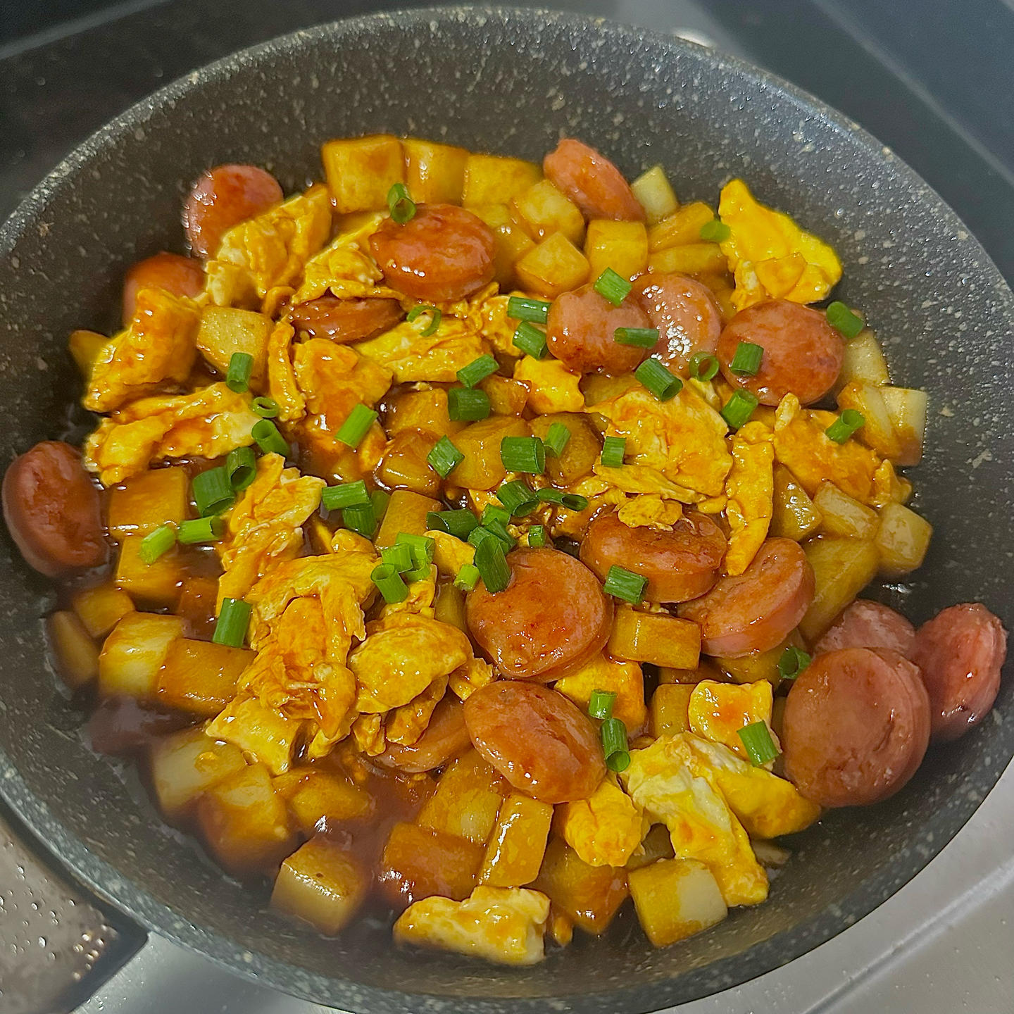 在完成了所有的前期准备之后,我们进入最后的混合阶段。将之前炒好的鸡蛋和烤肠重新回锅,此时,倒入我们事先调好的酱汁,利用中火翻炒,使酱汁充分包裹在鸡蛋、烤肠和土豆丁上。翻炒的过程不仅可以让食材更加入味,还可以使酱汁均匀分布,提升整道菜品的色香味。最后,撒上葱花增添香气,再次翻炒均匀后便可以出锅了。