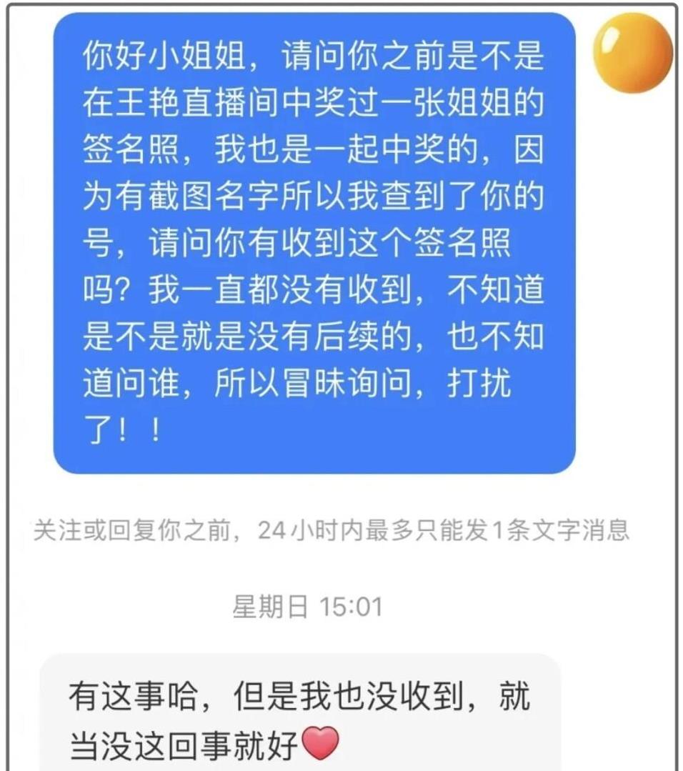 王艳直播抽奖风波有位网友发帖抱怨王艳。他说在王艳的直播间抽奖获得了一张她的签名海报,但是一直没有收到。他感到疑惑,就联系了工作人员,并提供了聊天记录作为证据。工作人员最初说几天后会收到,但之后又拖了半个月,他依然没有收到海报。