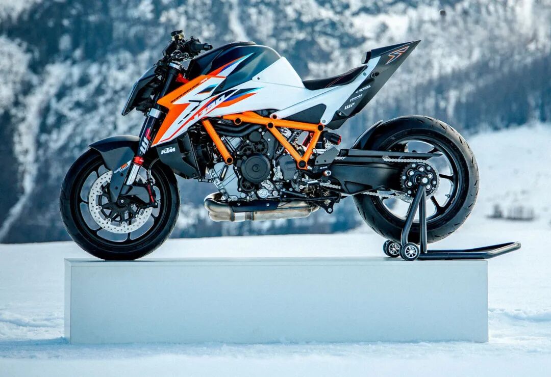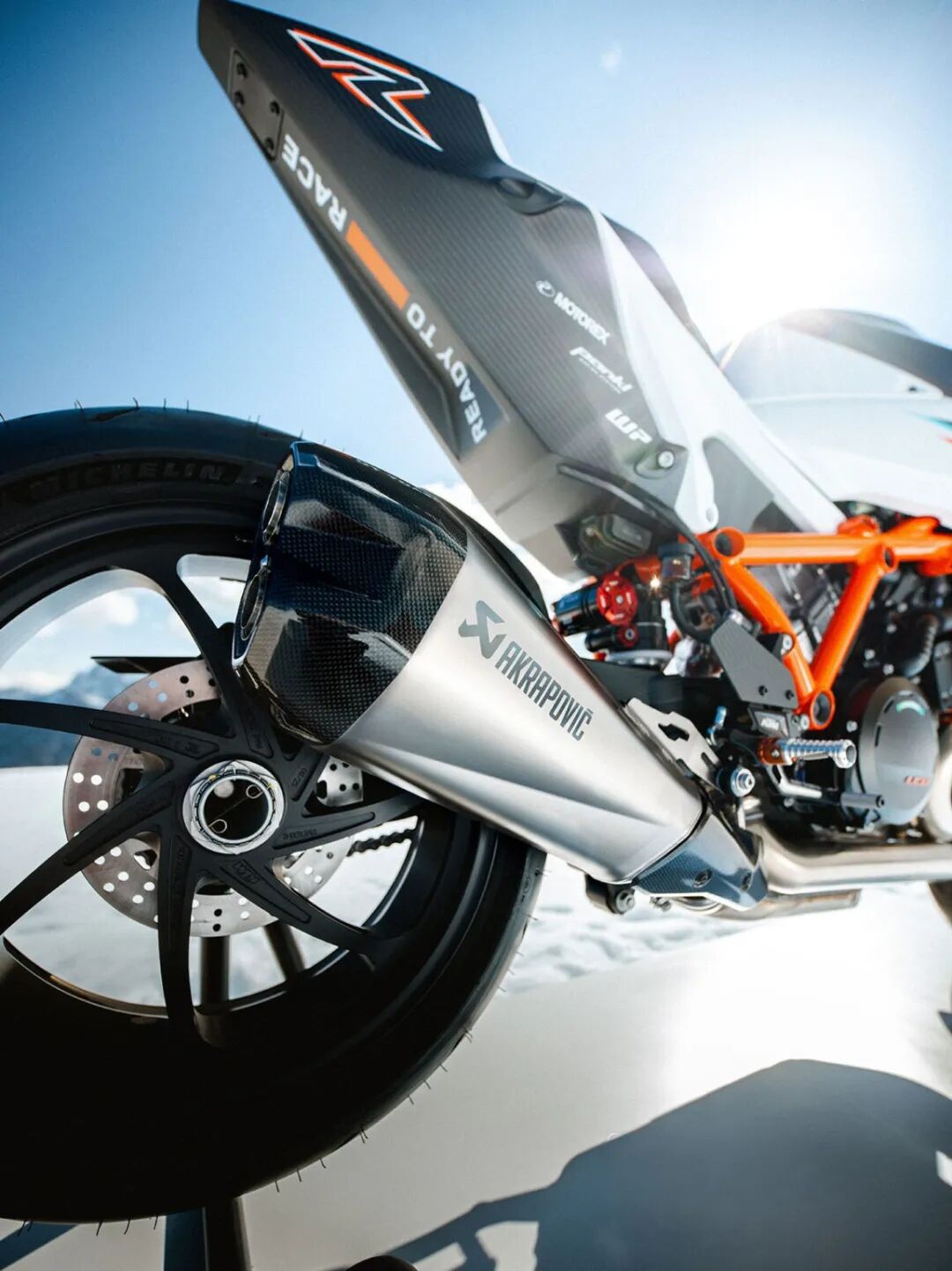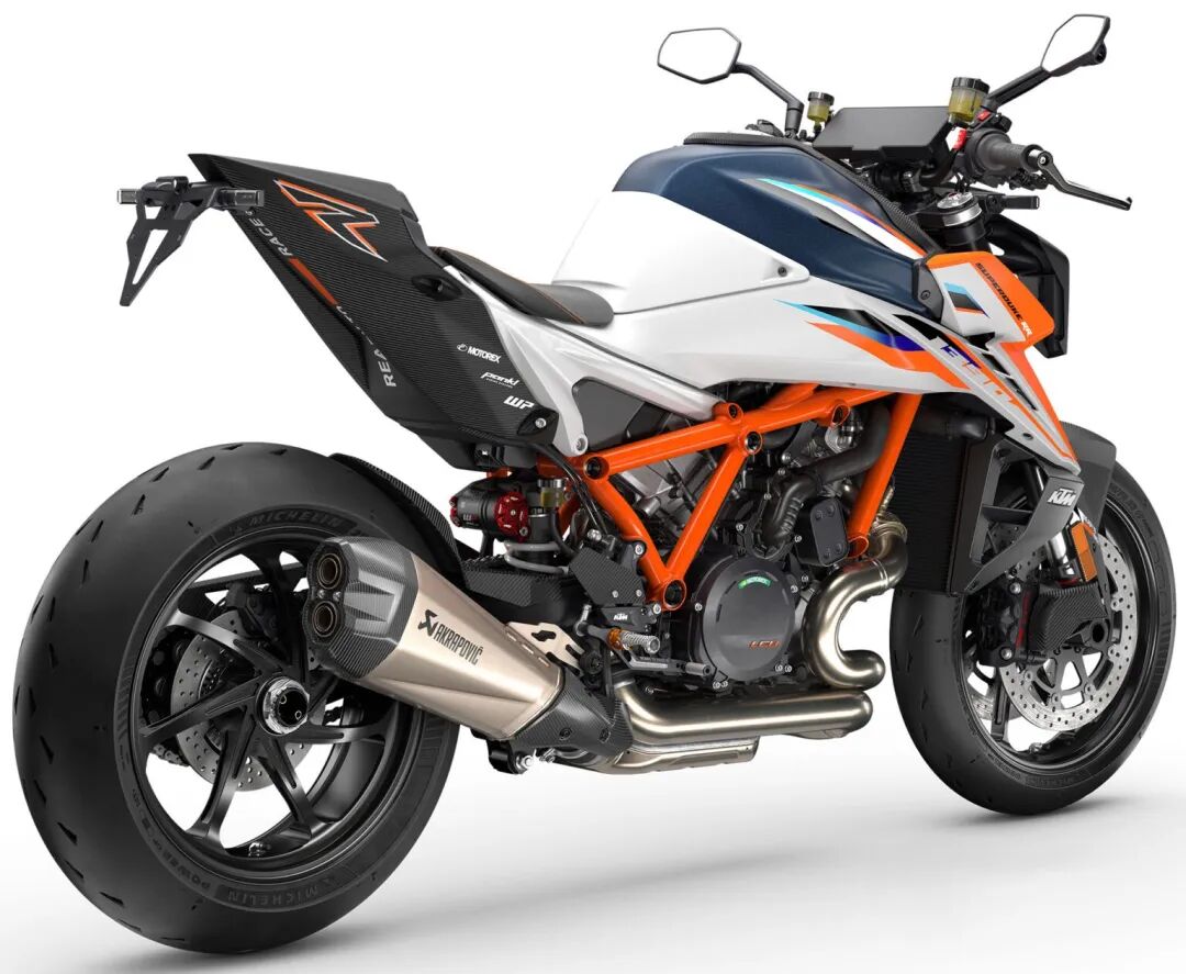 新车沿用的是KTM旗舰级1350cc 75° V型双缸LC8发动机,动力数据与标准版R保持一致,最大功率:193 PS / 10,000rpm,峰值扭矩:145 N.m / 8,000rpm,但通过专属的Akrapovič(天蝎)钛合金尾段排气与ECU调校,声浪与爆发力更显狂暴。减重的同时释放更浑厚、更具攻击性的声浪。