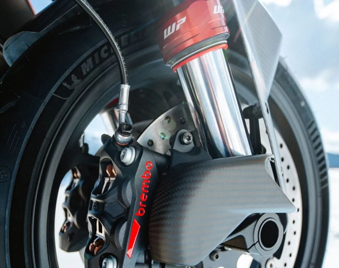 悬挂系统(赛道级手动可调)上WP Pro 7548 封闭式的倒立前叉(加压油室,阻尼更稳定),压缩、回弹全可调;后减:WP Pro 8750 定制后减震(50mm大活塞),支持高速/低速压缩阻尼独立调节。直接换掉了EVO的半主动电子悬挂,换为更纯粹、更硬核的赛道级手动悬挂,路感与操控极限拉满。电子悬挂虽然看着高科技,但在正真的赛场上,永远不及简单的机械结构更实用。