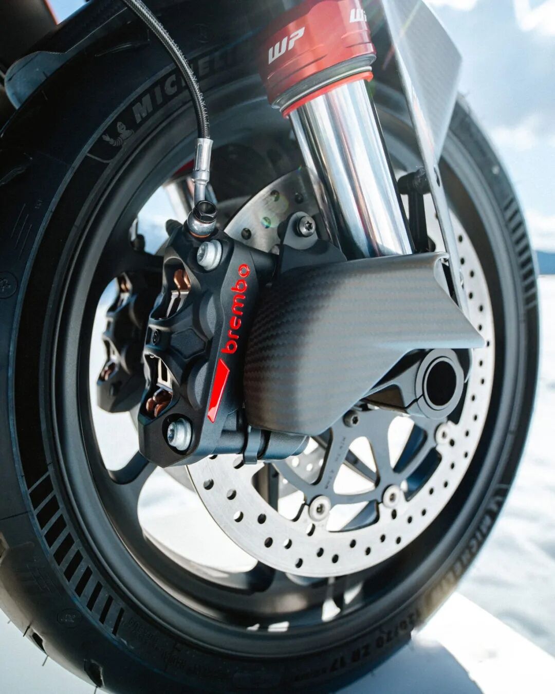 制动系统上(手感更硬、响应更快),搭载前刹Brembo HyPure Sport 一体式四活塞卡钳 + 320mm浮动盘,相比普通版Stylema卡钳,刹车力提升、拉杆行程缩短50%、手感会更直接;后刹则是Brembo双活塞卡钳 + 240mm刹车盘。