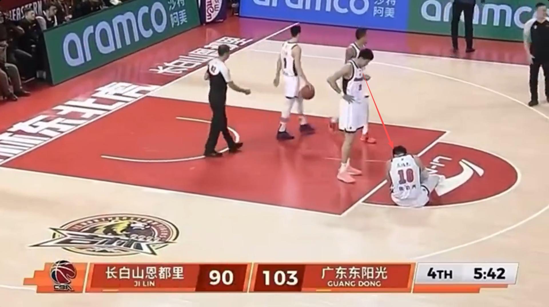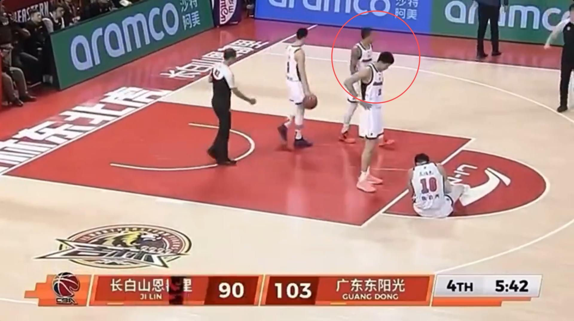昨晚还有一个画面,个人觉得不对劲。比赛战至末节还剩5分42秒时,焦泊乔被队友胡明轩绊倒,前者显然是扭了脚,倒地后一度没有起来,最后被队友扶着单脚跳出场外。焦泊乔倒地后,等吉林进攻回合完成后,裁判吹停了比赛,此时焦泊乔还未起来,附近的队友王少杰和奎因纷纷前去看望焦泊乔,关心他的伤情。而绊倒焦泊乔的胡明轩却漠不关心,抱着球扬长而去。虽然我是广东球迷,也要对胡明轩这种冷漠的态度进行批评。