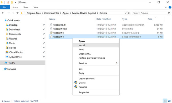 进入 C:>“Program Files”>“Common Files”> Apple >“Mobile Device Support”> Drivers。找到名为“usbaapl64.inf”或“usbaapl.inf”的文件,右键单击并选择“安装”以重新安装 Apple 的驱动程序。