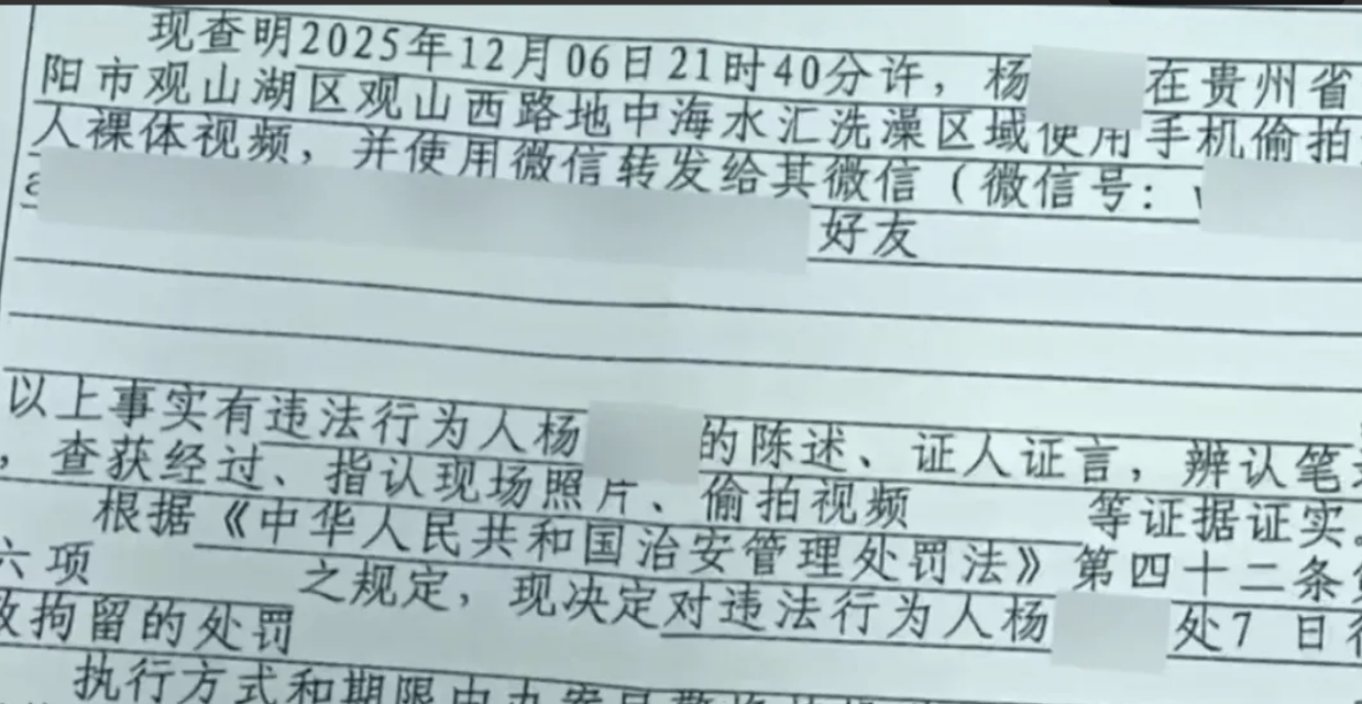 熊女士当即抢夺手机,并与对方发生争执。她回忆,在争夺手机的十多分钟里,现场并无工作人员出面制止或协助。事后报警,民警将偷拍者杨某某带走。经查,杨某某手机中存有多名在洗浴区被偷拍女性的隐私照片和视频,其中一段29秒的视频里,三名女性的面部和身体均清晰可见。杨某某已将部分内容通过微信转发给他人。最终,公安机关依据《治安管理处罚法》,对杨某某处以行政拘留七日的处罚。