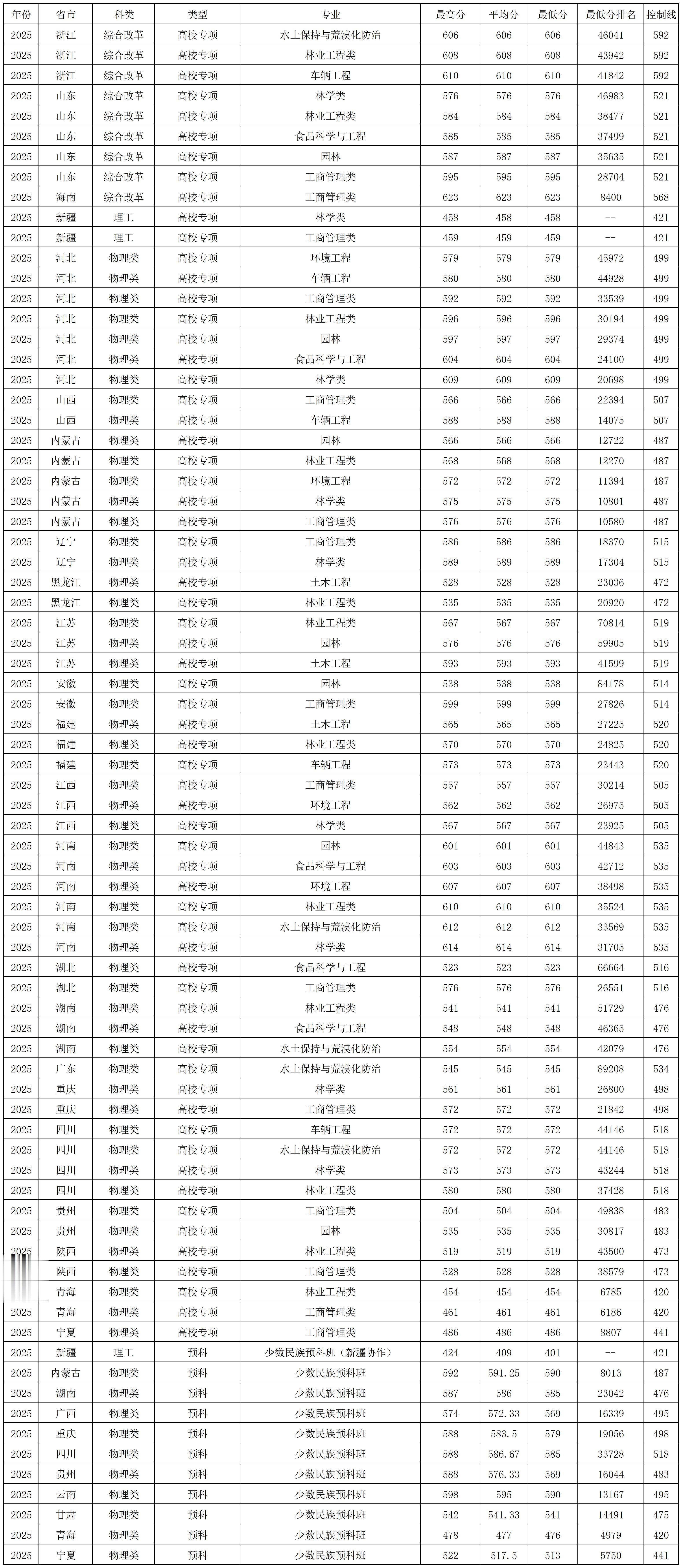 北京林业大学2025年高校专项、预科在各省各专业 录取分数线