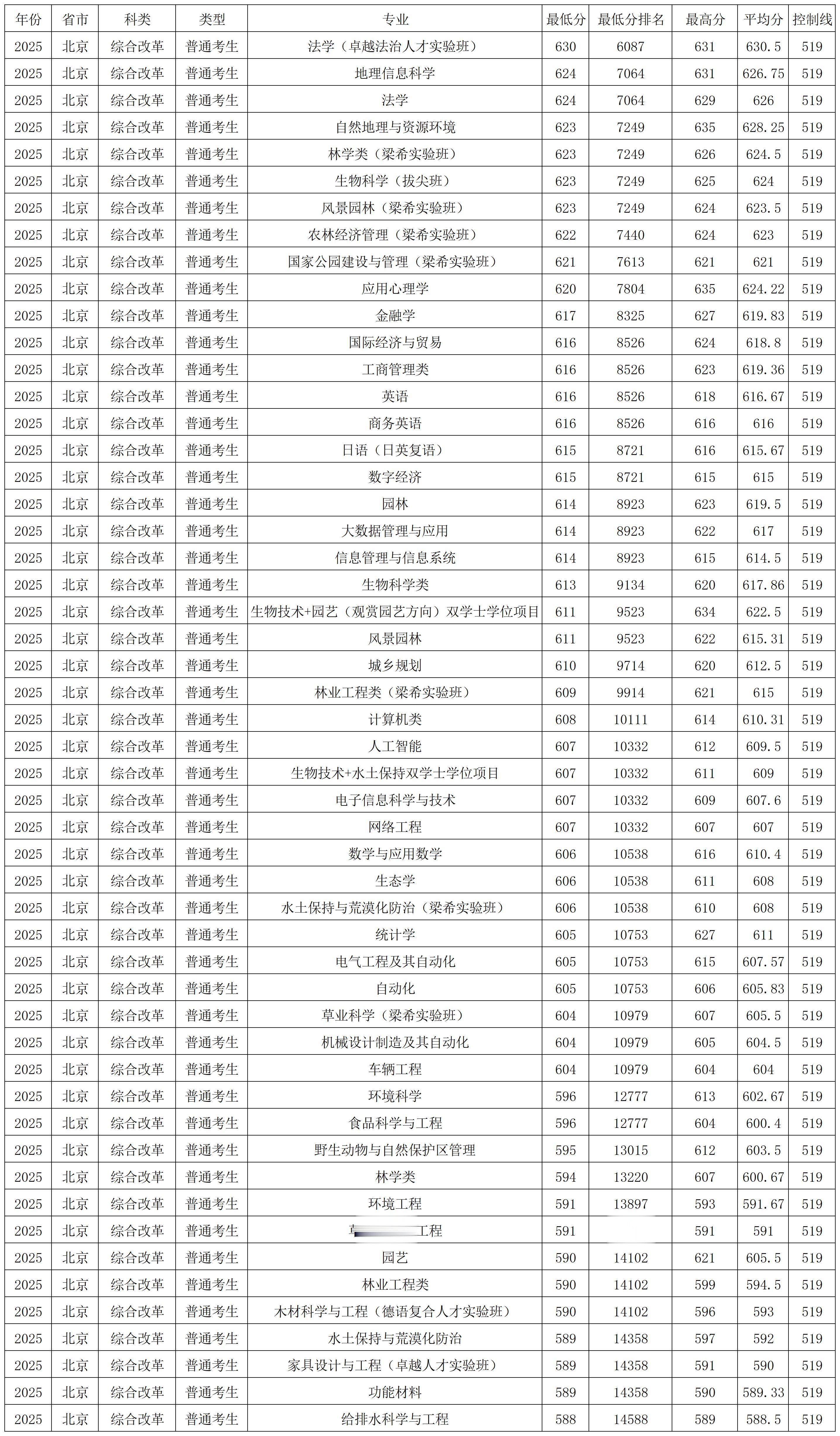 北京林业大学2025年在西藏、新疆各省各专业 录取分数线