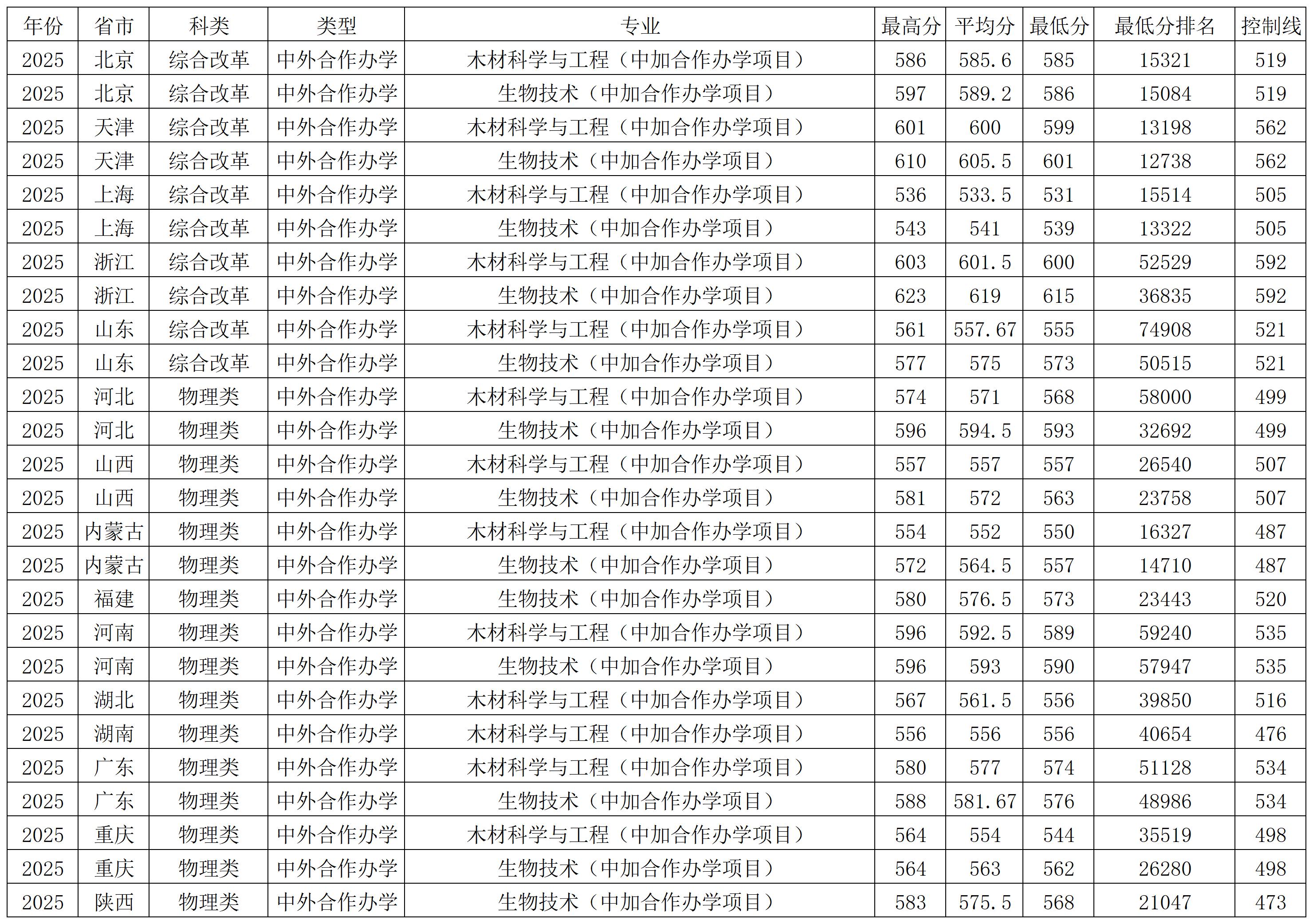 北京林业大学2025年中外合作办学在各省各专业 录取分数线