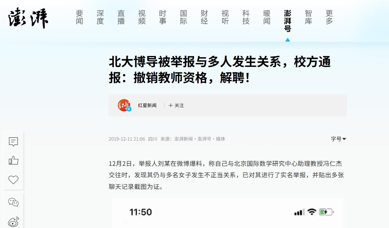 2019年12月2日,有网友在微博公开了多张聊天截图信息,举报北大国际数研中心助理教授,导师冯某杰同时与几十名女性交往,而且已与多名女性发生关系,作风混乱。随后根据官方媒体的报道,冯某杰已被解聘!