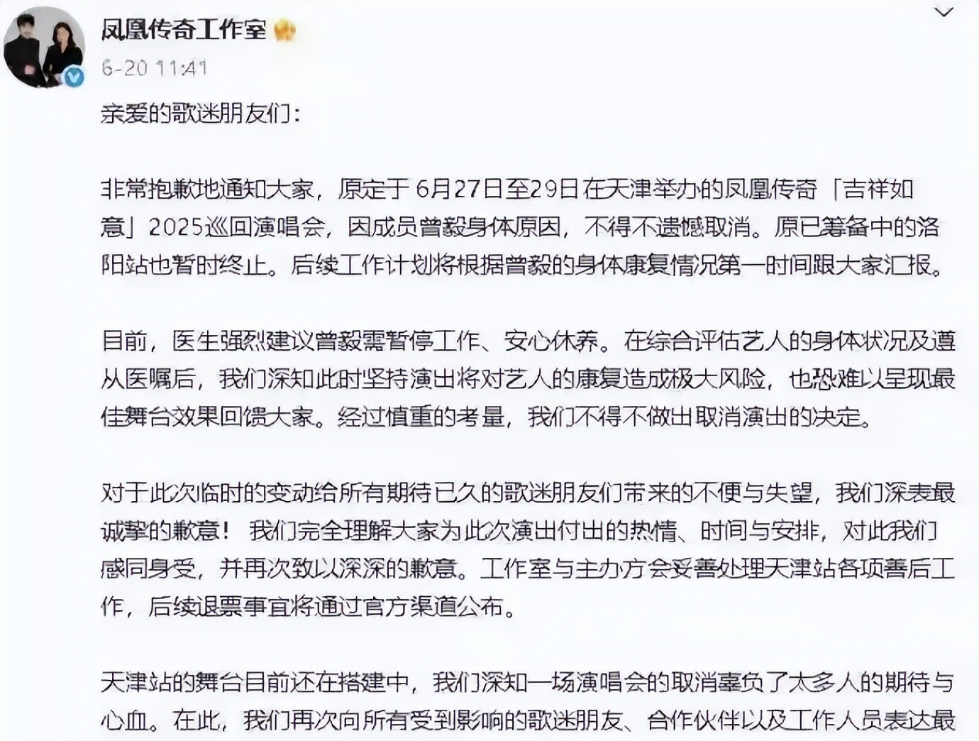 自从曾毅出事之后,凤凰传奇的多场演唱会最终也没有办法如期举行了,这也让很多观众感到非常的意难平。