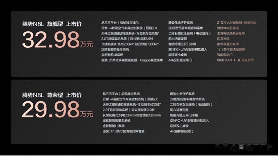 10月28日,“大六座安全豪华SUV”腾势N8L正式上市,共推出2款车型,官方指导价为29.98万元~32.98万元!N8L全系标配“六大核心科技”,以超越传统豪华的品质标准,诠释家用车的豪华感、安全感与科技感,创造让全家人动心、舒心、省心、安心、暖心的出行体验,以“五心体验 三感相伴”定义美好出行,将奢华体验平等赋予每一位家庭成员。
