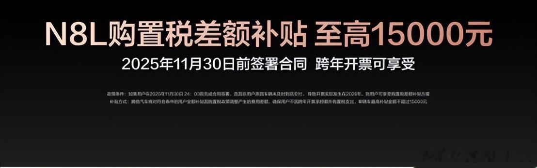 为回馈广大用户的支持与信赖,腾势N8L特别推出限时购车权益,权益价值至高10.67万元!包括价值1.7万元的三年免息,最高1万元的置换补贴。此外,不必担心因为交车晚,享受不到购置税补贴:在2025年11月30日24点前完成合同签署的用户,如果因非用户原因车辆未及时交付,导致开票实际发生在2026年,可享受购置税差额补贴,最高1.5万元!