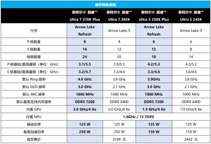 先看处理器本身。这次测试的酷睿Ultra 7 270K Plus和酷睿Ultra 5 250K Plus,属于Arrow Lake Refresh架构的更新。与不带Plus后缀的型号相比,两款新品都增加了4个能效核,Ultra 7 270K Plus的核心总数来到24个,与Ultra 9 285K相同;Ultra 5 250K Plus则达到18个核心。在频率方面,P核与E核的最高睿频也有小幅提升,更重要的是内部互联的Ring频率和D2D频率分别提高了100MHz和900MHz,默认内存支持从DDR5 6400升级至DDR5 7200,这些硬指标的变化直接影响了数据传输延迟和游戏性能。软件层面,英特尔提供了二进制优化技术,通过APO工具开启后,在支持的12款游戏与应用中平均可带来8%的性能增益,最高达到22%。