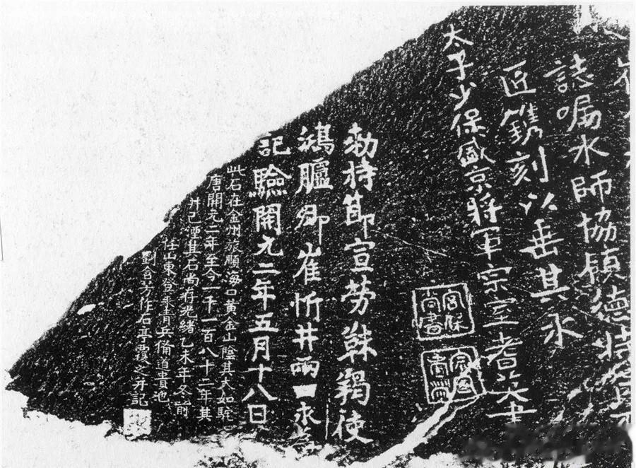 公元714年,唐玄宗派鸿胪卿崔忻出使东北,册封靺鞨部落首领,确立唐朝对该区域的管辖。使命完成后,崔忻在旅顺黄金山凿井两口,立碑刻文为证。