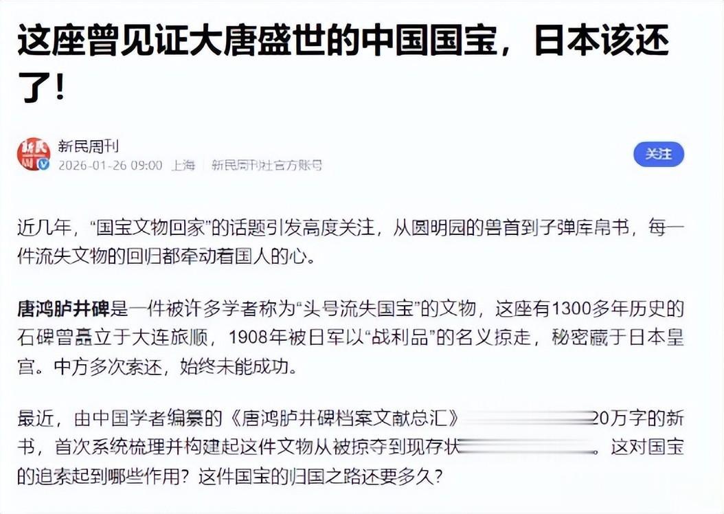 2026年1月16日,《唐鸿胪井碑档案文献总汇》在上海发布,这部近120万字的典籍,收录了368份原始档案,其中《战时清国宝物搜集方法》一文,直接证实日方对中国文物的劫掠是政府主导的有组织行为。