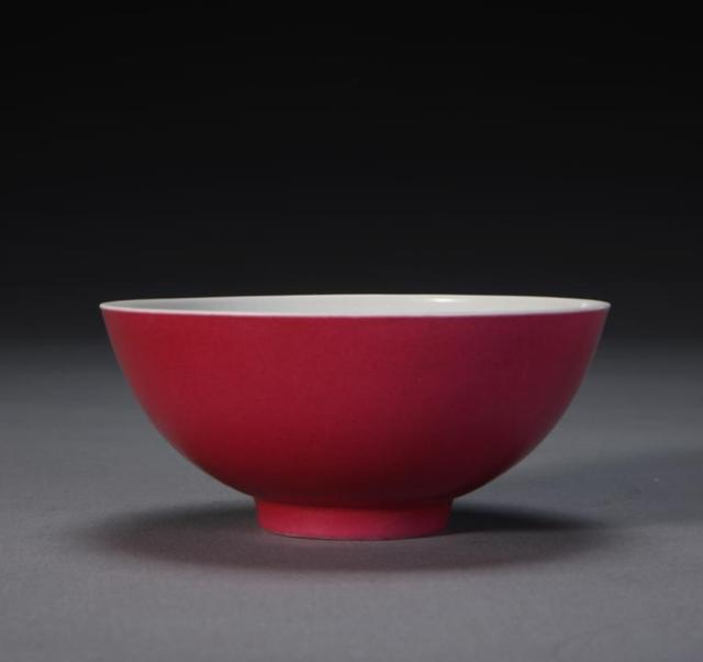 红釉也是雍正单色釉瓷器中的一个重要品种。在康熙时名噪一时的郎窑红、豇豆红等品种,在这一时期逐渐没落下去,但高温铜红釉如祭红,在这一时期仍有烧造。值得一提的是在康熙时传入中国的一种以微量黄金为呈色剂的金红釉,在这一时期成了名贵品种。这种金红釉是一种低温釉,颜色像玫瑰或蔷薇,所以也有“玫瑰红”、“蔷薇红”等称谓。常见的器型多是盘、碟、杯、碗等小件器物,且一般器物外壁施红釉,内壁则施白釉。