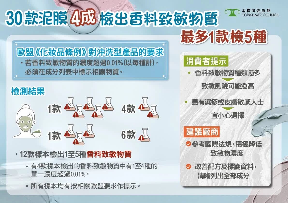 测试还发现12款样本(占4成)检出一至五种香料致敏物质。虽然全部样本均未检出欧盟《化妆品条例》禁用的2种香料致敏物质,但产品中香料致敏物质种类越多,致敏风险相应增加。曾患湿疹或属敏感肌肤人士,应避免使用含大量致敏物质的产品。