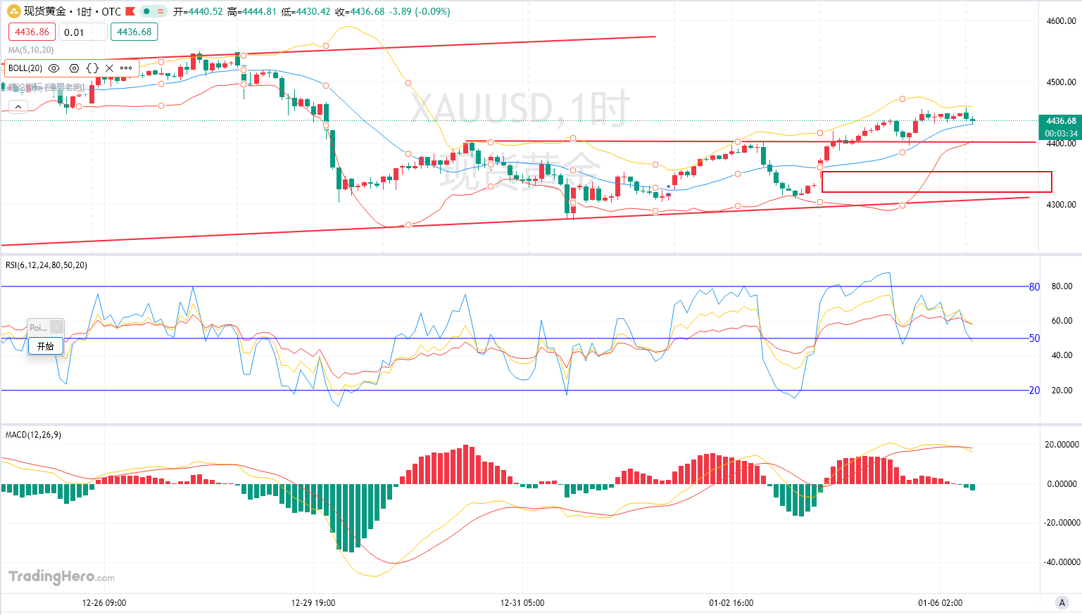 1小时趋势线支撑目前上移到4400附近,这个位置也是多空分界线,可以先看这里的表现再做判断。我个人认为,顶背离修复加上周一缺口的牵引,短期可以尝试看空。