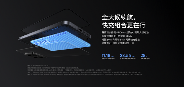 魅族 22 还支持 80W 有线快充与 66W 无线快充,仅需 23 分钟即可充至 50% 。实验室数据显示,魅族 22 整机续航可达 11 小时以上,视频播放 23 小时,待机更长达 28 天,彻底消除续航焦虑。